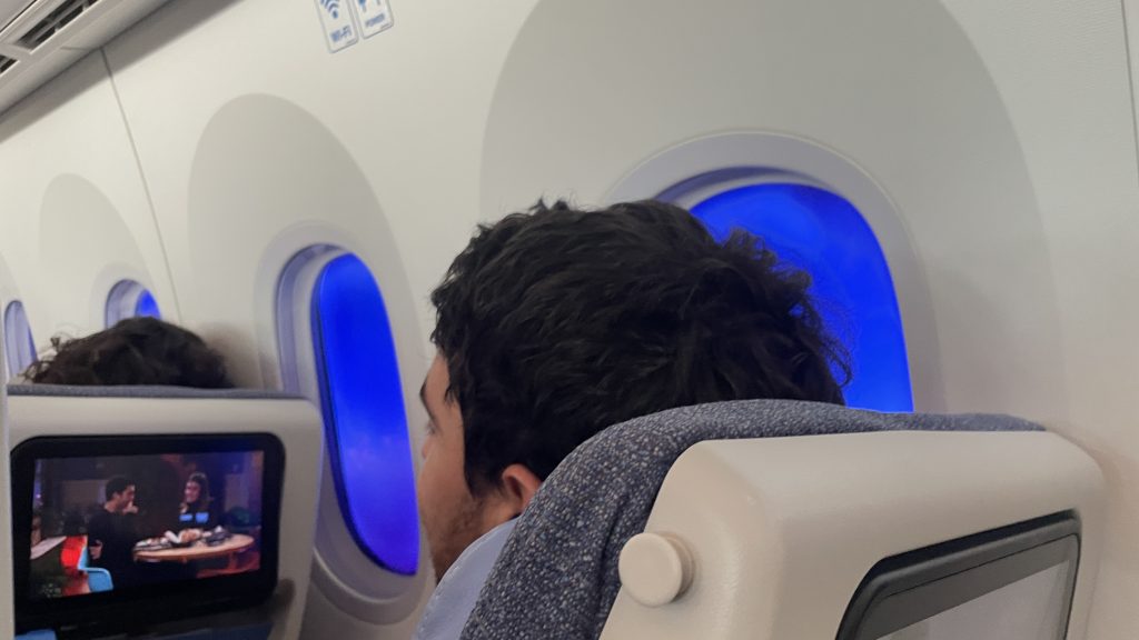 Die Boing 787 ist ein großes Flugzeug, mit 9 Sitzen in einer Reihe. Der zur Verfügung stehende Platz ist mehr als beim Flug von Frankfurt. Aber bequem ist es nicht. Die Sitze sind hart, und der Winkel ist ungünstig.