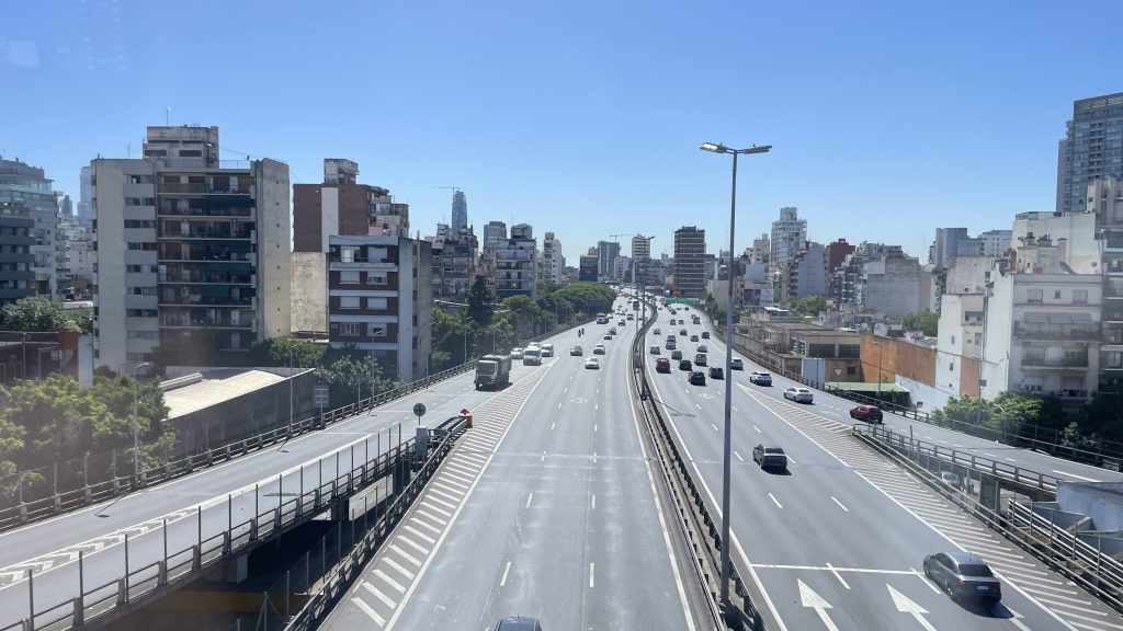 Zu Fuß sind wir über die breiteste Straße der Welt. 6 Spuren in der Mitte, 3 weitere Spuren außen. Und es gibt noch Busspuren. Das Ganze für beide Fahrtrichtungen.