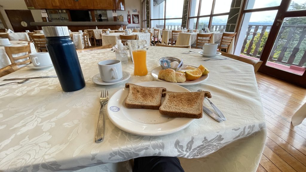 Das Frühstück ist ab 07:00, und die verwitterte Küchenschönheitskönigin ist gerade fertig mit dem eindecken. Ich hab mir heute morgen Ingwer geschnitten, und wollte meine Thermosflasche mit heißem Wasser auffüllen. Ich bin gerade dabei, da erklärt mir die Küchenfurie auf spanisch, dass ich das nicht darf.