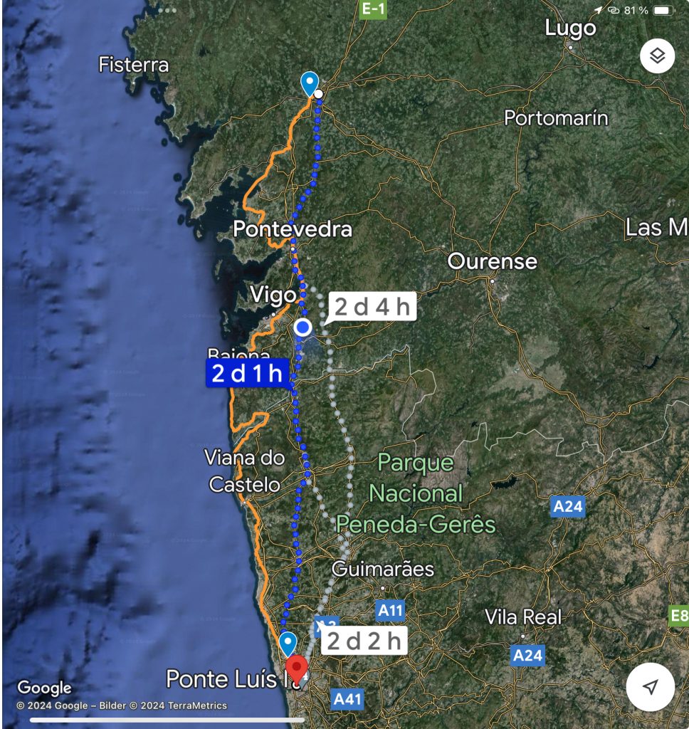 Ab O Porrino sind es noch ca. 100 km bis Santiago de Compostella – das Ende des Pilgerweges. Aller Pilgerwege.