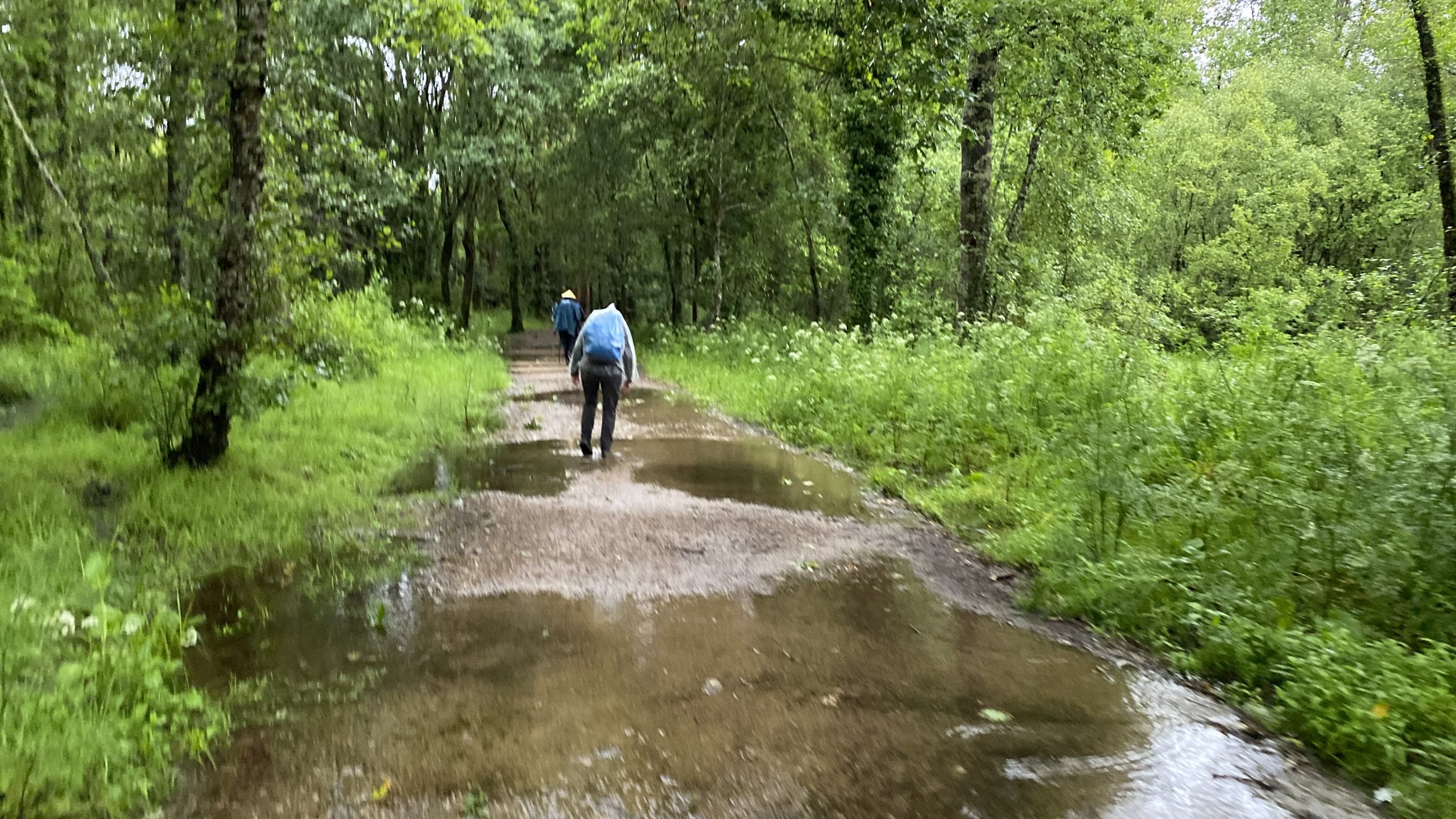 Aber es sollte noch schlimmer kommen. Im Wald ist ein ganzes Teilstück überflutet, und das Wasser scheint relativ tief zu sein. Irgendwie geht der Weg auf der anderen Seite weiter.