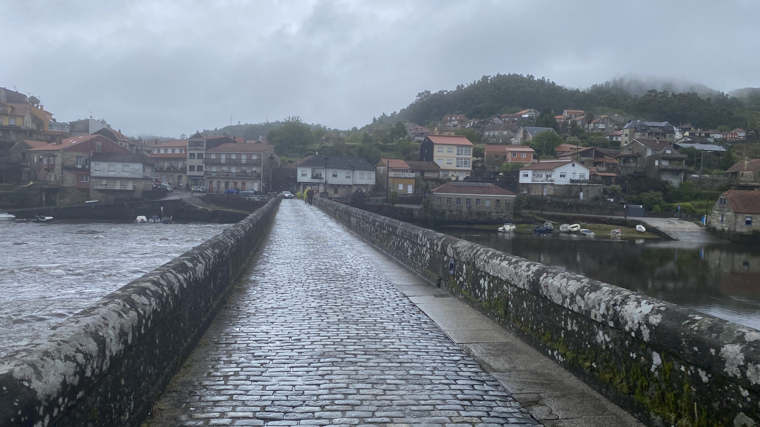 Der Weg ändert sich nicht wesentlich, immer wieder sind Stellen überflutet. Aber es gibt auch Brücken. Um kurz vor 14:00 erreiche ich Pontevedra. Eine Temperaturanzeige an einer Apotheke zeigt 22° C. Scheint eine Prognose zu sein. Die wärmste Anzeige unterwegs zeigte 15°C. Aber es soll ab morgen besser werden.