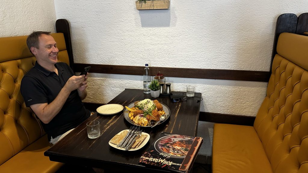 Plötzlich hat Jürgen Hunger, und er bestellt eine Kleinigkeit.