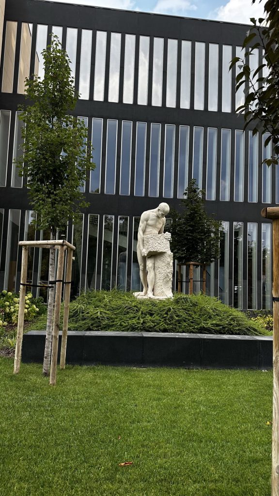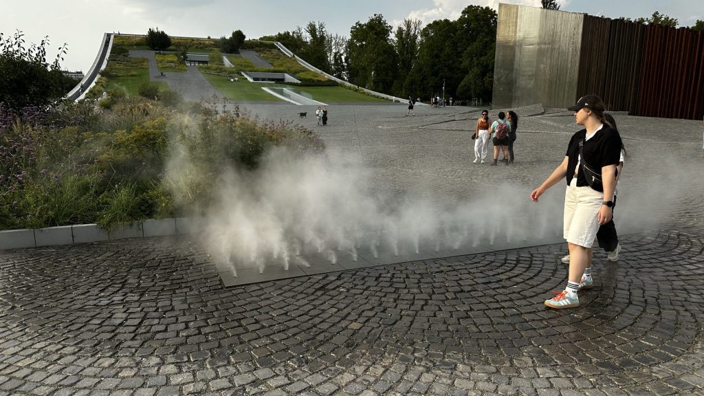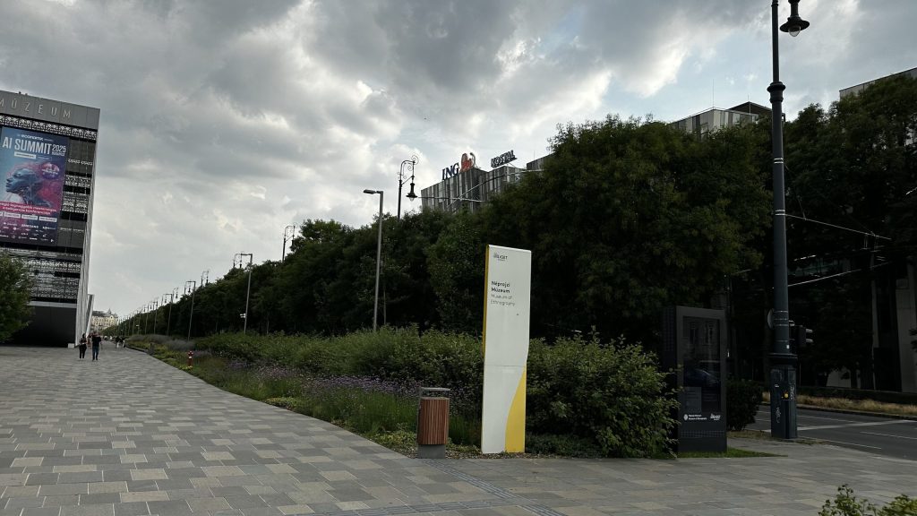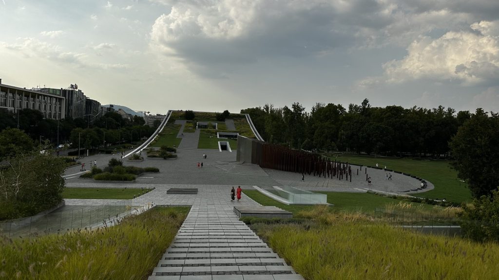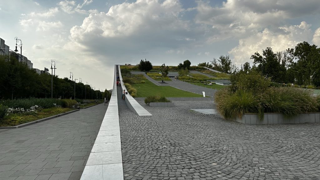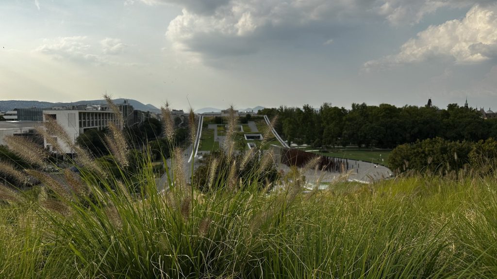 Auf dem Weg zurück zur Donau kommen wir noch an einem Museum mit interessanter Architektur vorbei. Das Dach der beiden Gebäudeteile ist rampenförmig gebogen, und in den Park integriert.