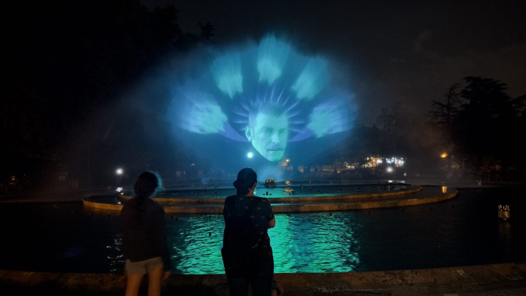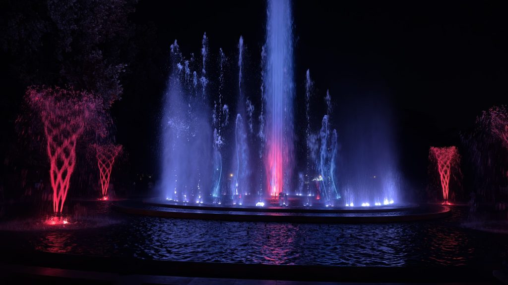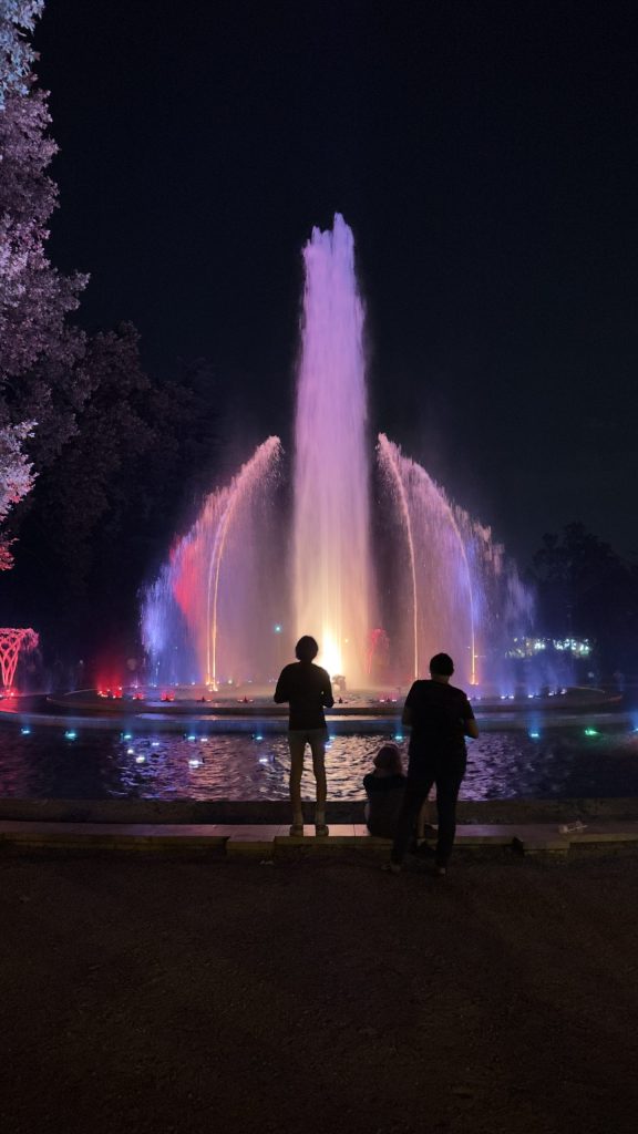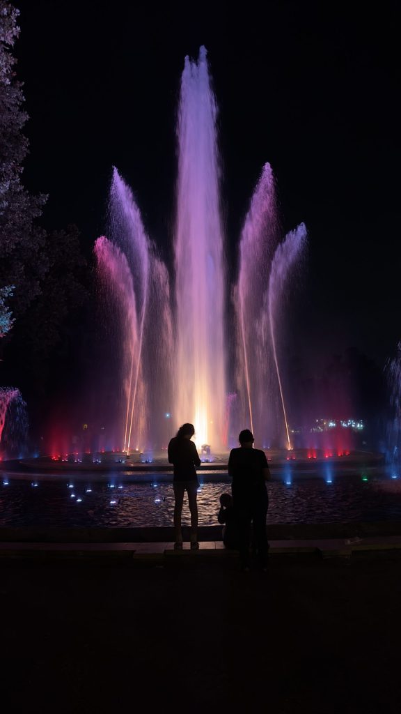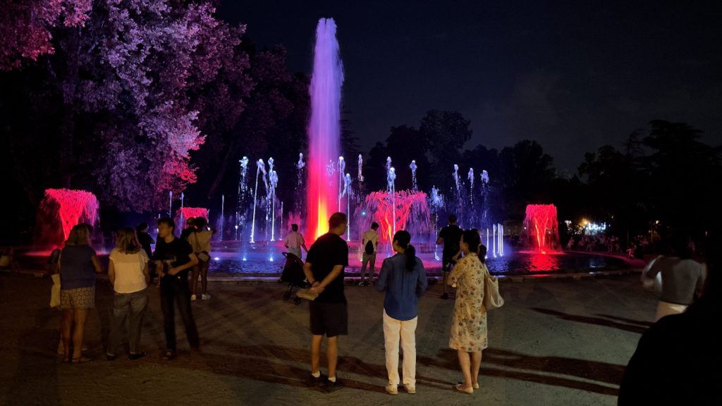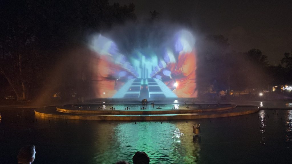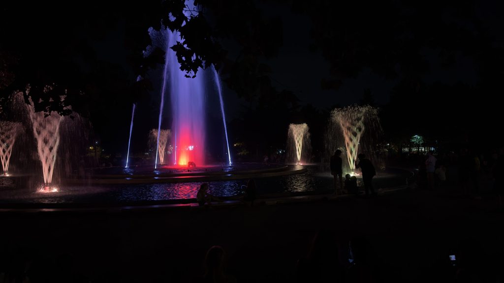 Und laufen dann über die Brücke, die einen Abzweig zur Insel hat. Auf der Insel gibt es ein imposantes Wasserspiel im Rhythmus der Musik.