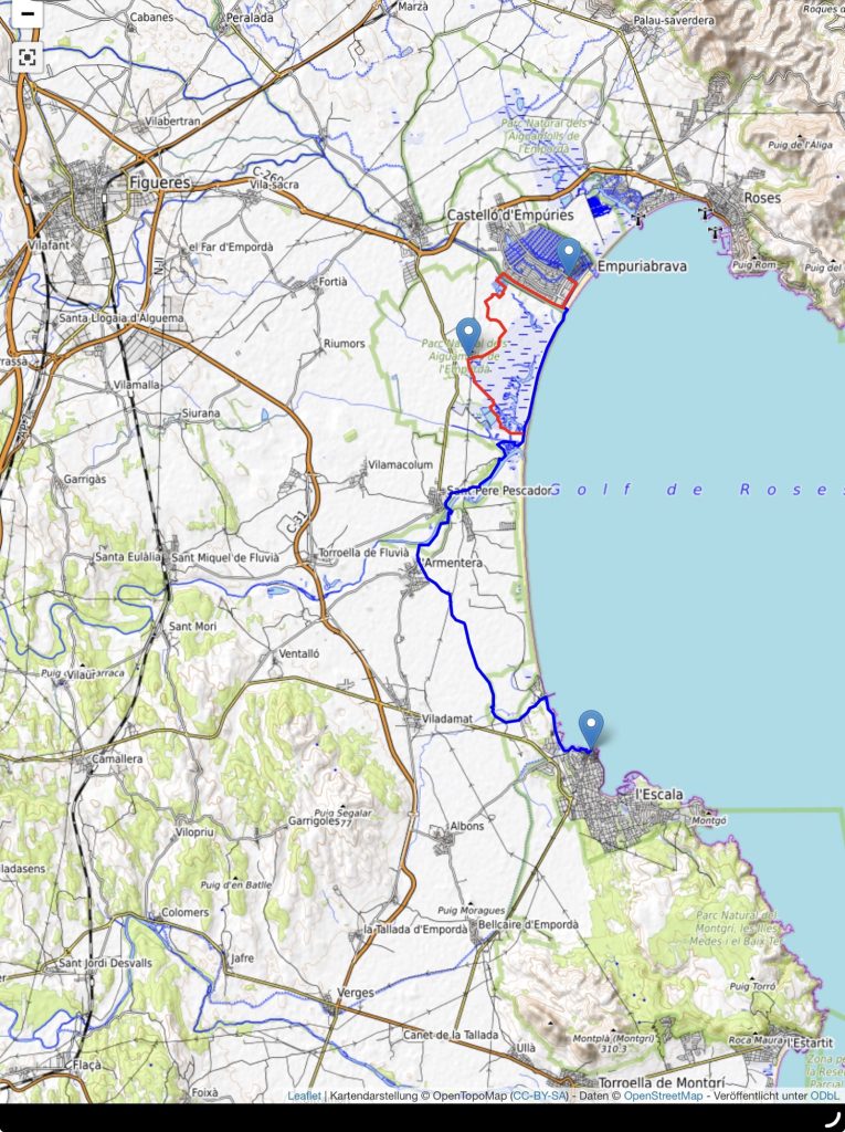 Der zum Naturschutzgebiet Parc Natural dels Aiguamolls de l’Empordà gehördende Strandabschnitt ist gesperrt. Dadurch ist ein Umweg notwendig (ca. 5 km zusätzliche Strecke). Hierzu läuft man am Ortsrand von Empuriabrava zunächst zur Brücke, die sich ca. 2 km im Landesinneren beim Klärwerk befindet. Von dort geht es über das Besucherzentrum des Naturparks in einem Bogen wieder in Richtung Strand.