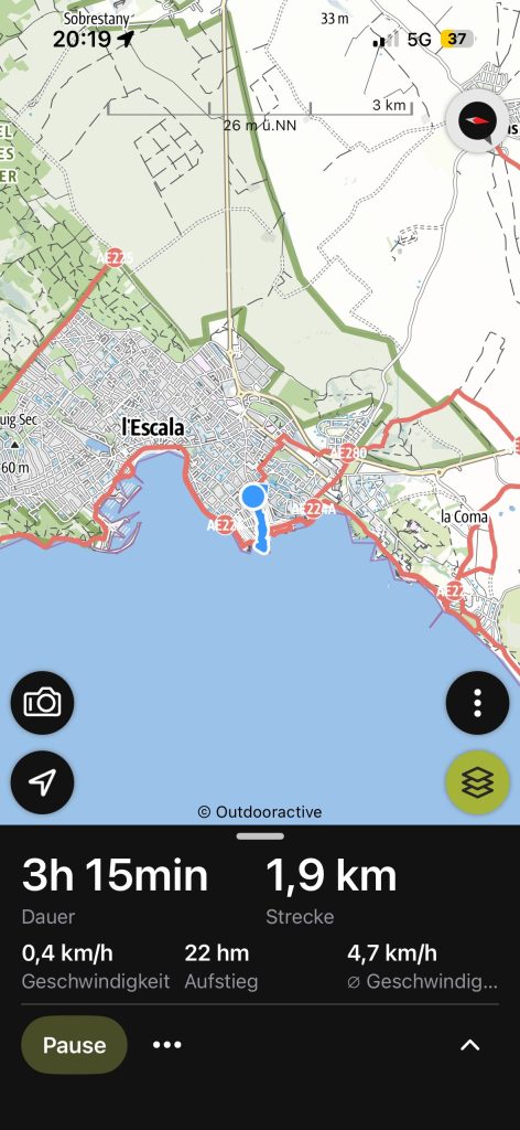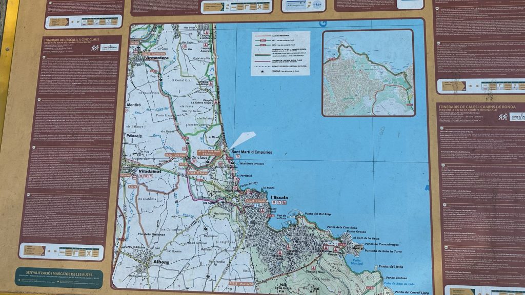Von L’Armentera aus führt der GR92 durch das flache Hinterland und biegt erst beim Dorf „Cinc Claus“ wieder in Richtung Küste ab. Hier treffen wir auf das mittelalterliche „Sant Martí d’Empúries“, um kurz darauf an griechisch-römischen Ruinen vorbeizuwandern. Der Weg verläuft als Promenade oberhalb des Strands entlang bis nach L’Escala, unserem heutigen Wanderziel.