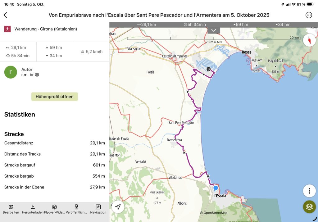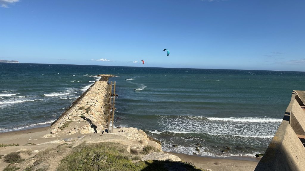 Gegen 15:30 erreiche ich wieder die Küste, bei Sant Marti d‘Empúris. Ein spektakulärer Anblick. Kite Surfer sind mehrere Meter in der Luft.