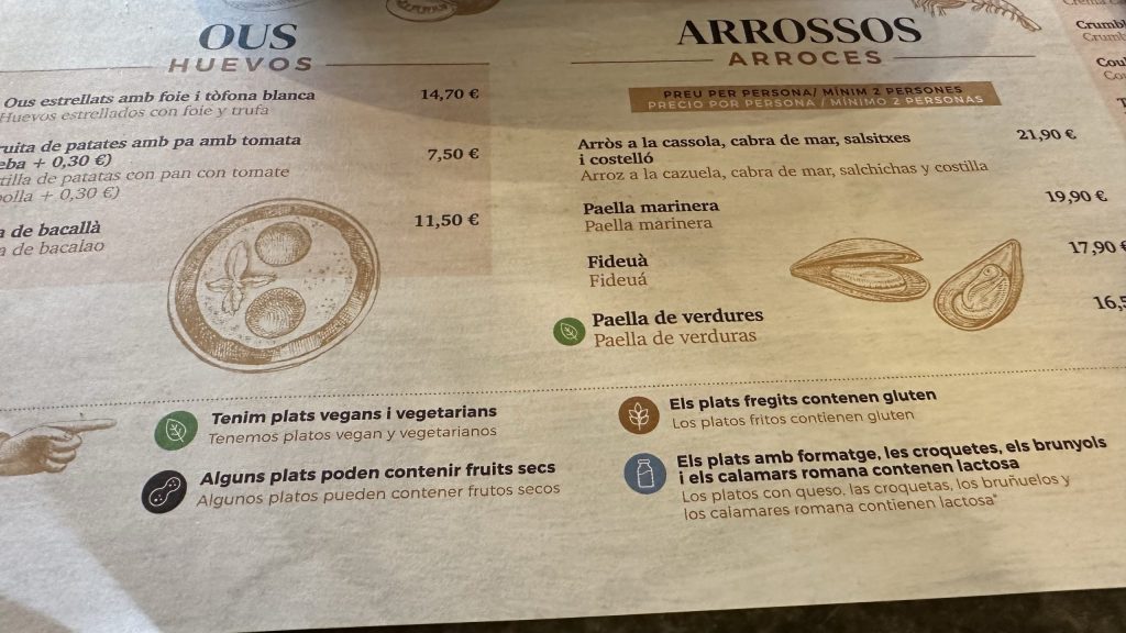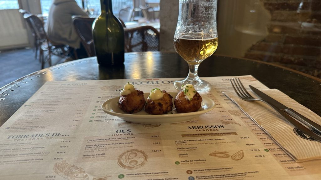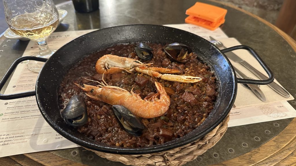 Ich frage die freundliche Bedienung nach einem Tisch für eine Person. Sie fragt ob ich auch essen möchte, natürlich, Paella! Sorry only from 7. Das heißt, jetzt gibt es nur Snacks. Es ist 17:10.