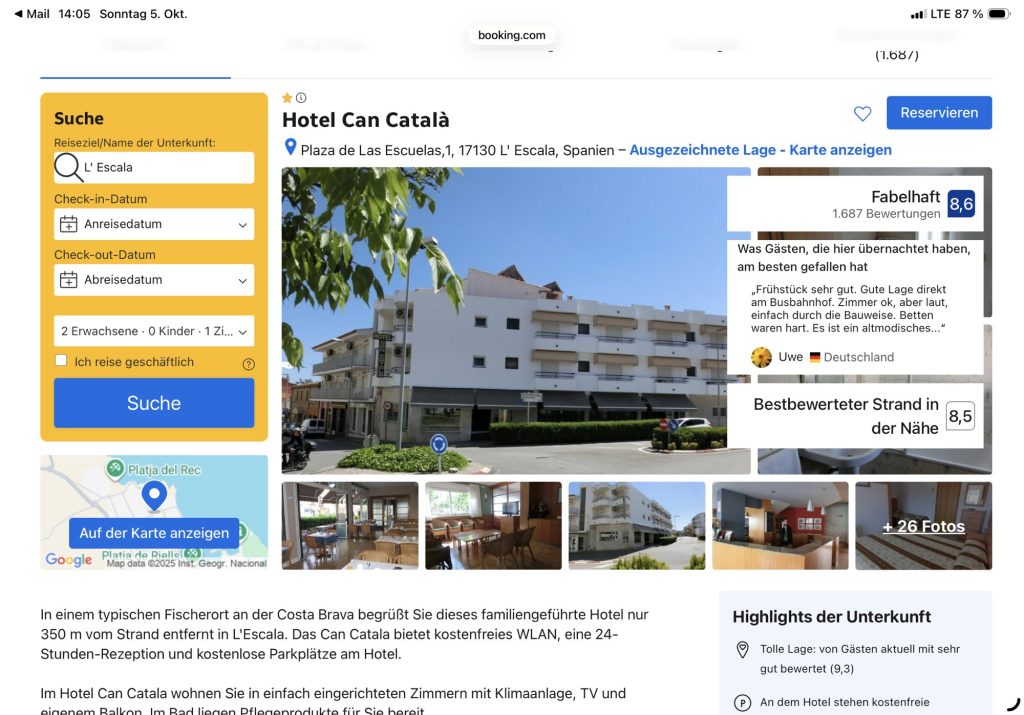 Ich hab eine Unterkunft in L‘Escala gefunden. Ein kleines Hotel mit Frühstück. Plaza de Las Escuelas,1, 17130 L‘ Escala, Spanien.