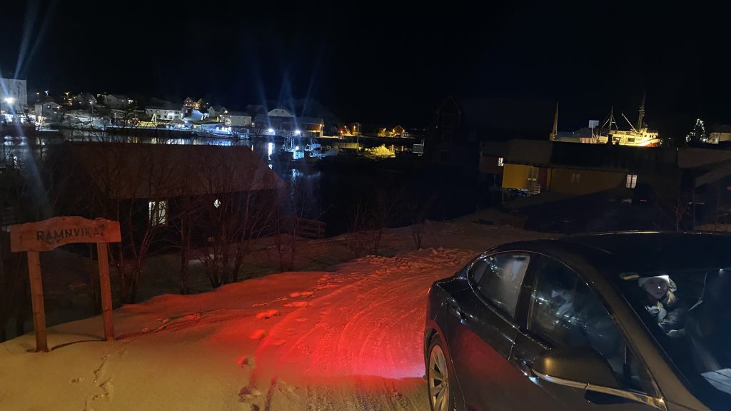 In Reine haben wir das Auto am Supercharger geparkt. Wir haben versucht herauszufinden, ob ein Aufstieg zum Reinebriggen möglich ist. Dazu wollten wir uns den Startpunkt ansehen, und dort hin laufen.