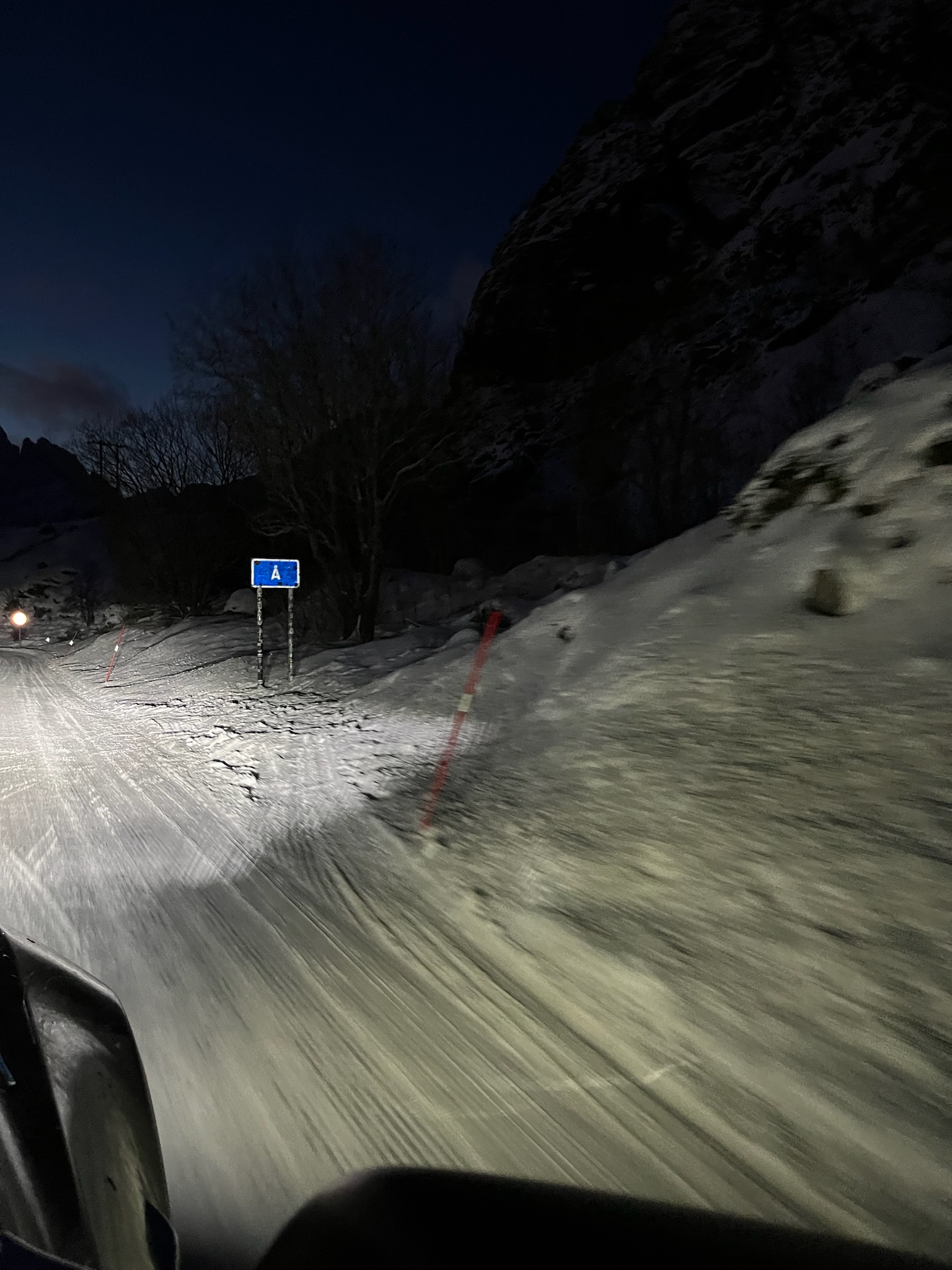 Von Reine sind wir weiter nach A gefahren, dem südlichsten Ort auf den Lofoten. Auf dem Weg dorthin gibt es noch eine Möglichkeit den Aufstiegsstart zum Reinebriggen anzusehen. Leider konnten wir aufgrund des hohen Schnees nirgendwo halten. Wir haben beschlossen auf dem Rückweg von A mit Warnblinker am Straßenrand zu halten, und den Startpunkt zu inspizieren.