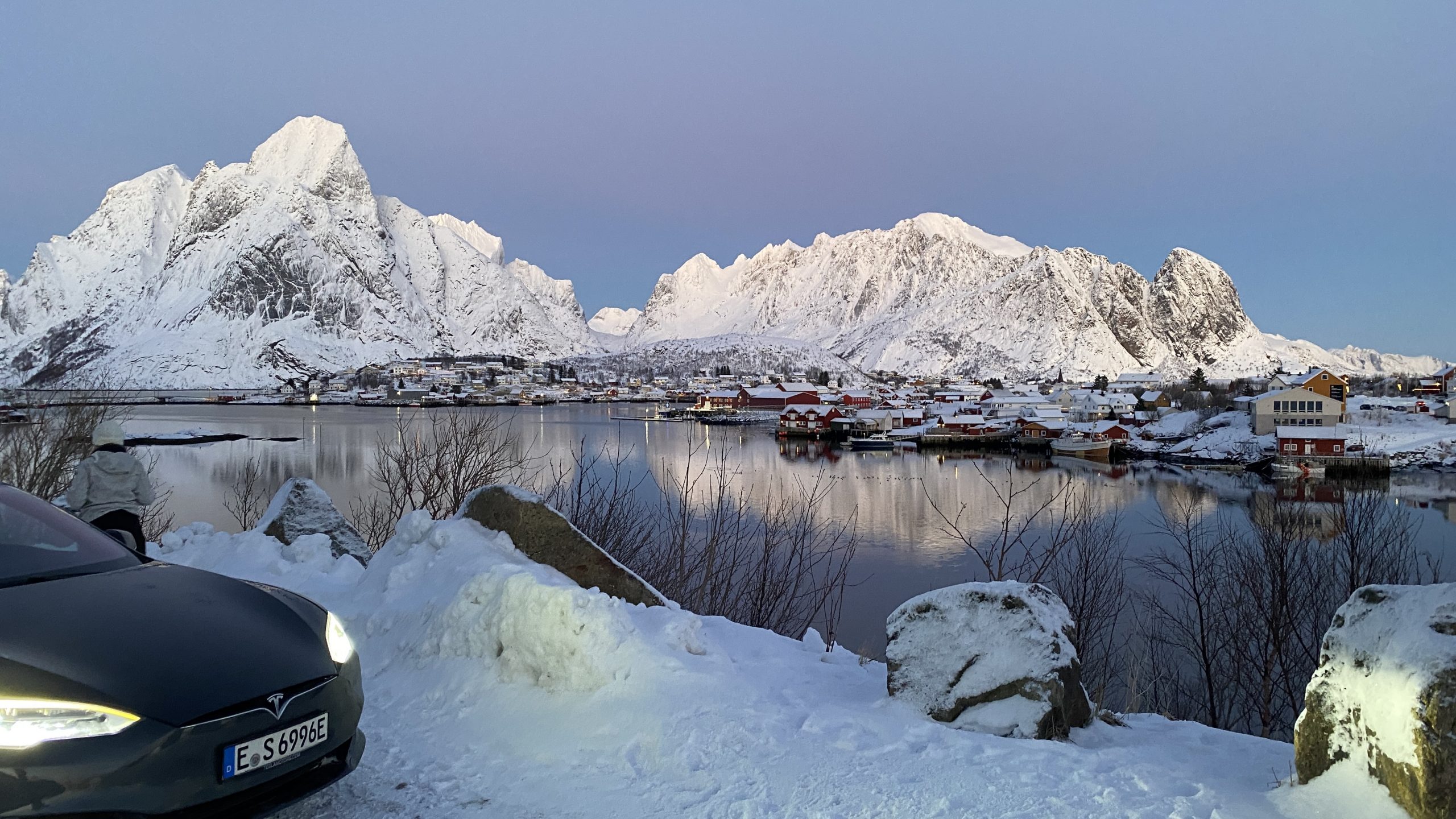 In Reine haben wir das Auto am Supercharger geparkt. Wir haben versucht herauszufinden, ob ein Aufstieg zum Reinebriggen möglich ist. Dazu wollten wir uns den Startpunkt ansehen, und dort hin laufen.