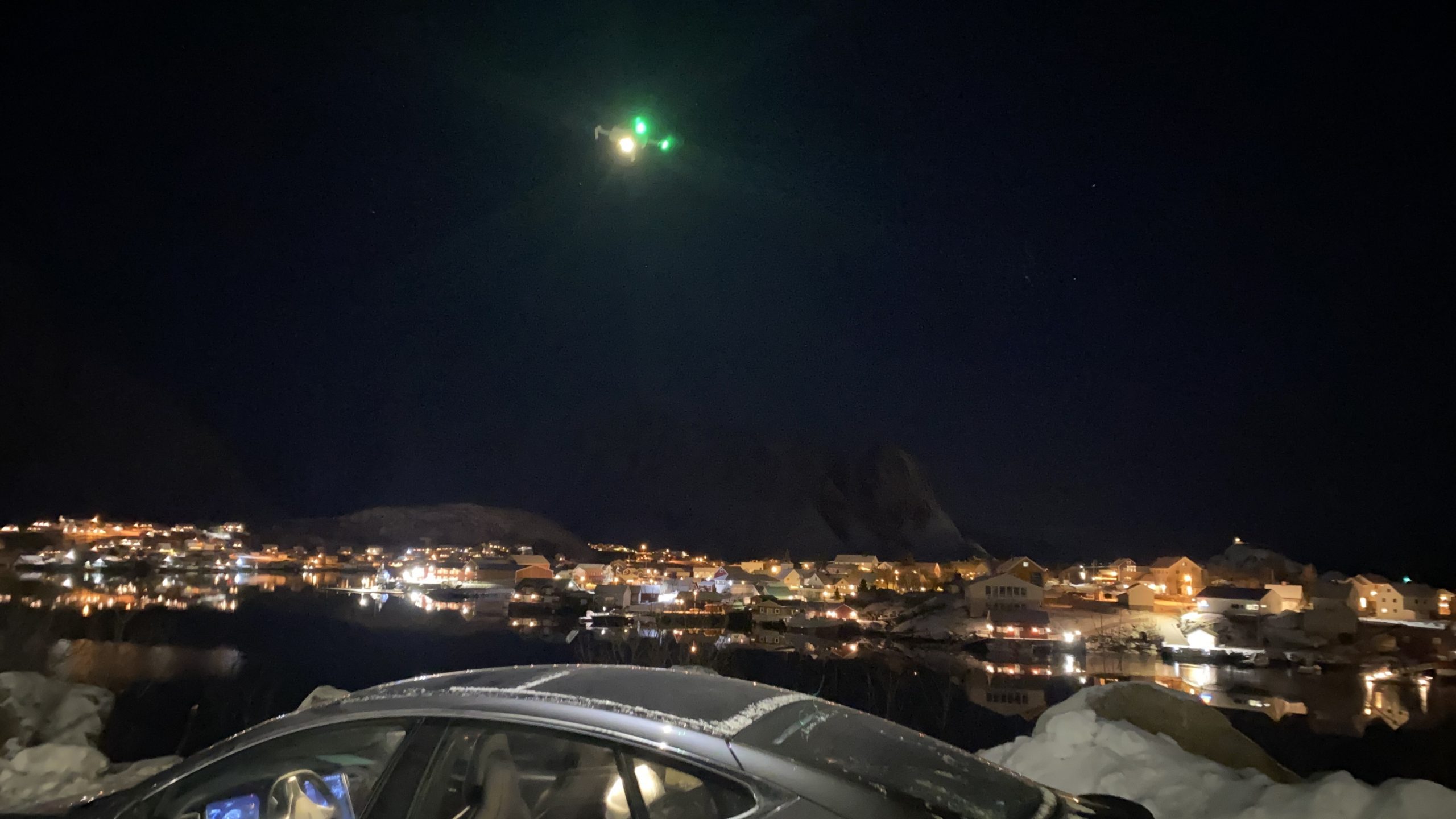 Auf dem Rückweg wird bei Reine der Drohne einmal die Gelegenheit gegeben, ihre Qualitäten in der Dunkelheit zu beweisen.