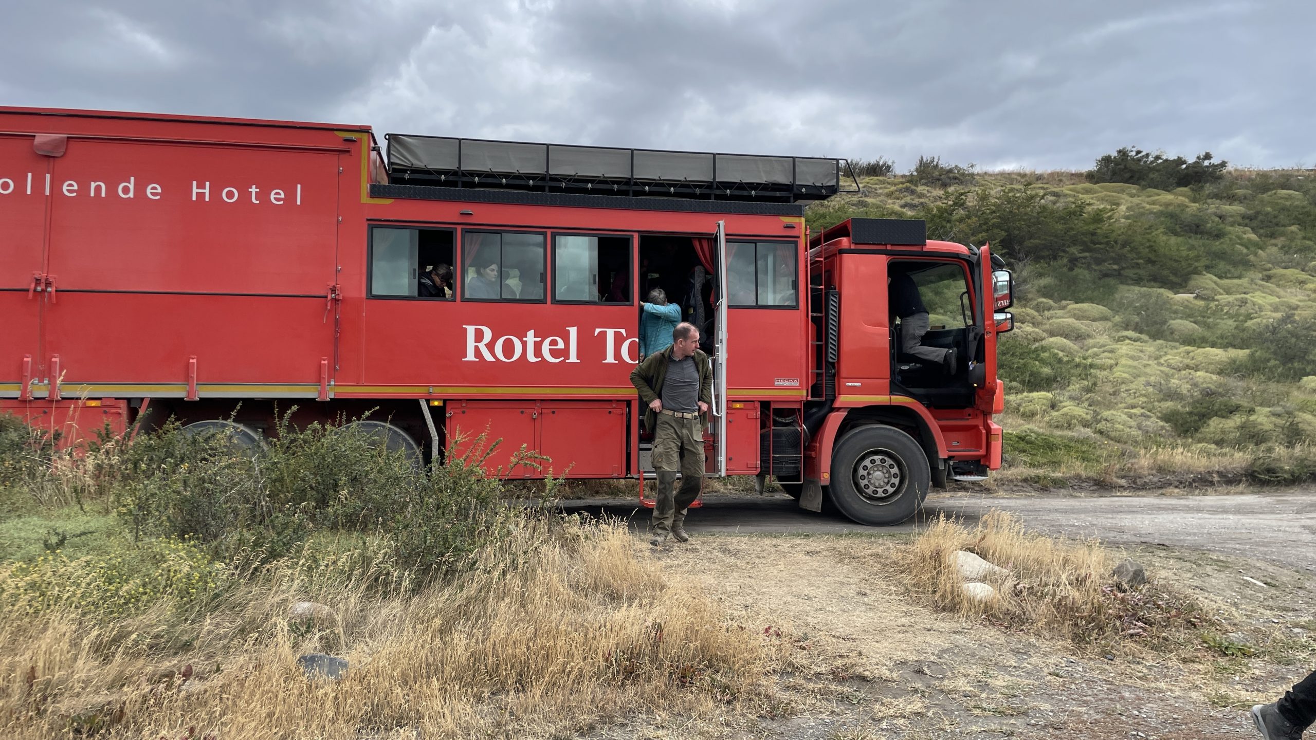 Die zweite Nacht im Rotel war wieder gut. Die meisten kleiden sich auf dem ausklappbaren Vorbau um, was zu einem ziemlichen Gewusel führt. Da hat man schon mal das Bein in der Hose der Person die neben einem steht.