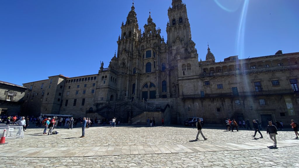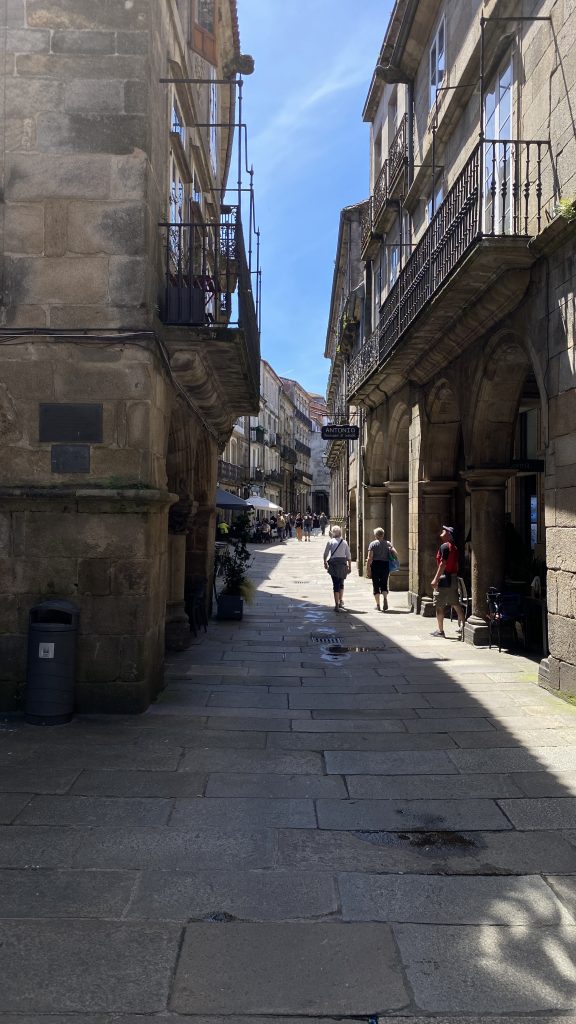 Ich sehe mehrer ratlose Pilllen, keine weiß wo sie das Zertifikat bekommen kann. Also lese ich nach. Man muss sich auf einer Webseite registrieren und seine Daten eintragen. Dann bekommt man per E Mail einen QR Code. Mit dem geht man zum neuen Pilgerbüro. Da bekommt man noch einen QR Code. Der wird irgendwann mit einem Desk angezeigt, wo man dann hingeht. Dort zeigt man seinen Pilgerausweis mit den Stempeln, und den QR Code per E Mail. Dann bekommt man die Urkunde. Nach dem Bezahlen darf man gehen. Moderner Ablasshandel.