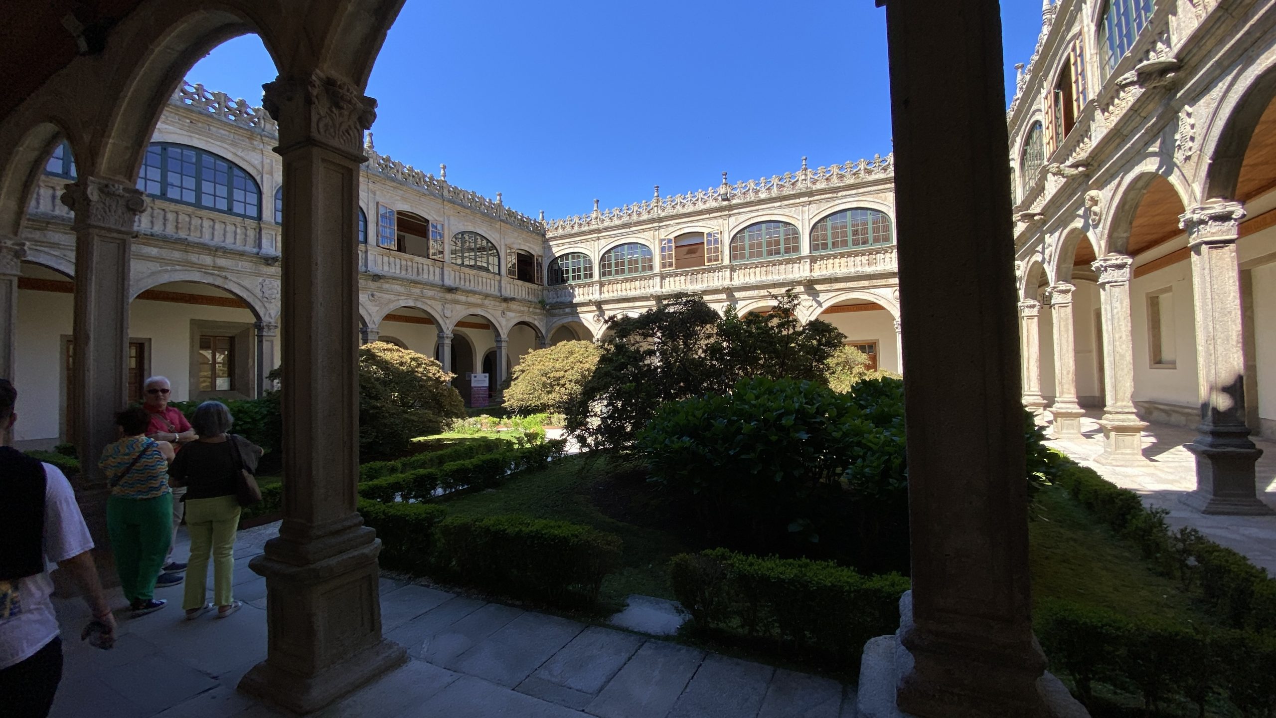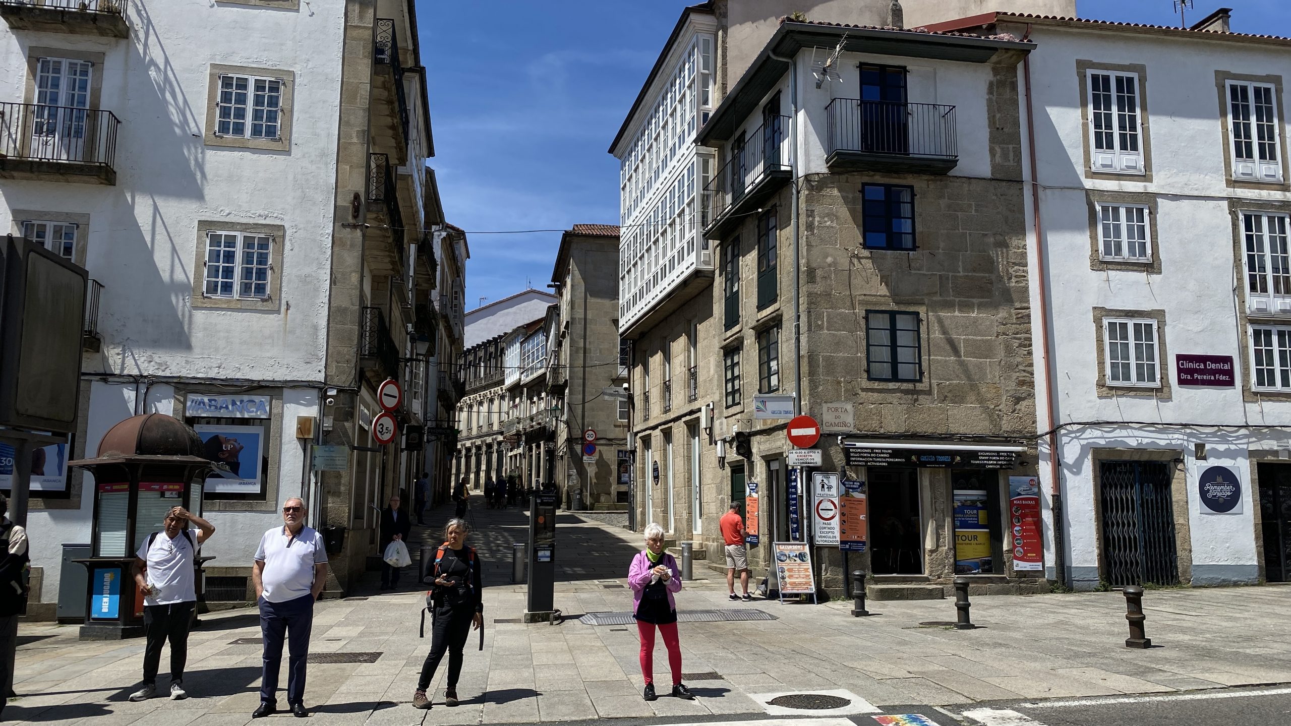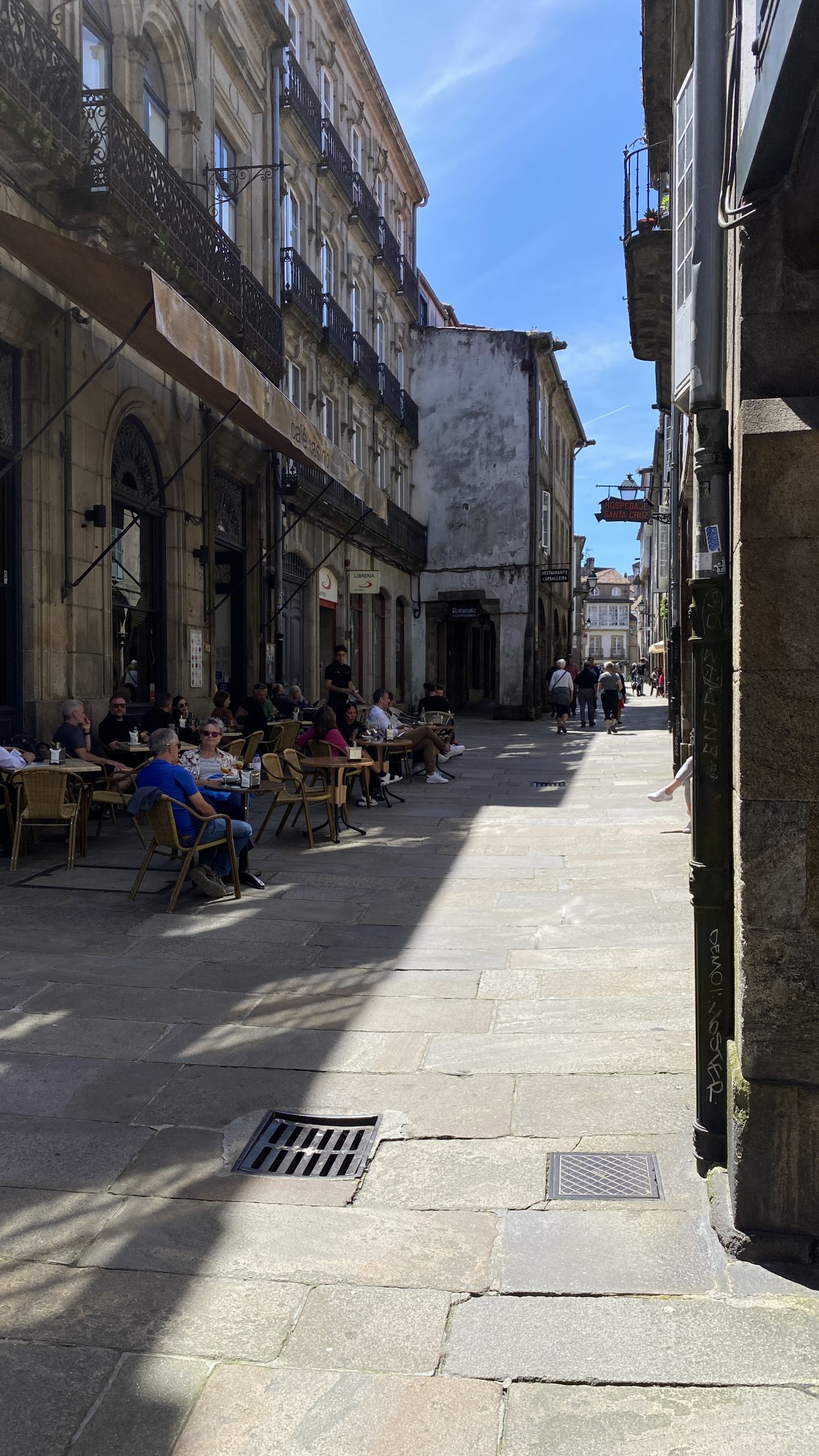 Ich sehe mehrer ratlose Pilllen, keine weiß wo sie das Zertifikat bekommen kann. Also lese ich nach. Man muss sich auf einer Webseite registrieren und seine Daten eintragen. Dann bekommt man per E Mail einen QR Code. Mit dem geht man zum neuen Pilgerbüro. Da bekommt man noch einen QR Code. Der wird irgendwann mit einem Desk angezeigt, wo man dann hingeht. Dort zeigt man seinen Pilgerausweis mit den Stempeln, und den QR Code per E Mail. Dann bekommt man die Urkunde. Nach dem Bezahlen darf man gehen. Moderner Ablasshandel.