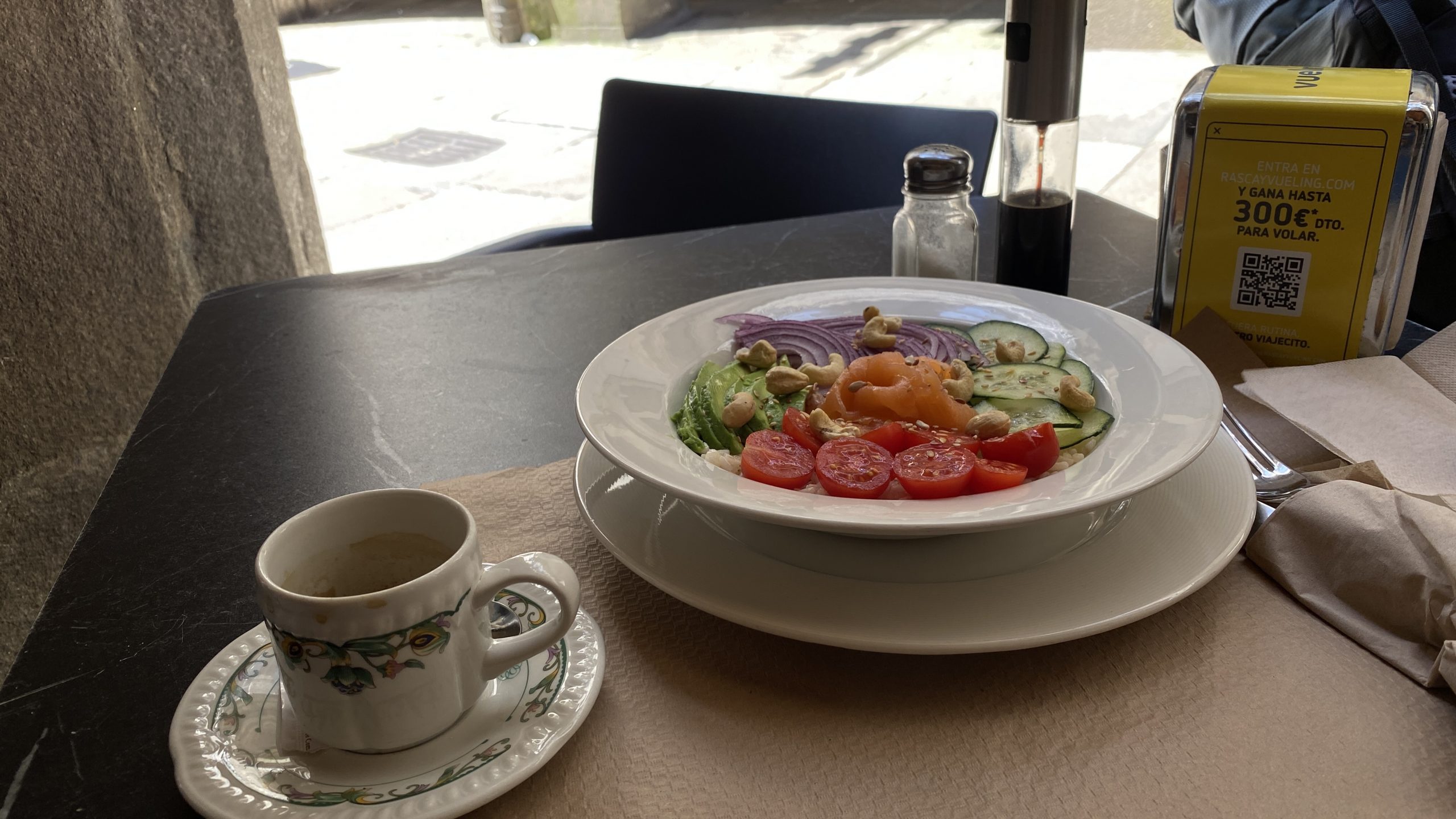 Als ich zum bezahlen gehe, kostete das ganze 12,70€. Das kann irgendwie nicht sein. Der Salat war 11€, dann 2 Espresso (sie hatten mein doublo nicht verstanden), und dann noch das Desert mit Kaffee. Man versteht mich nicht, ich mache mich schnell vom Hof.