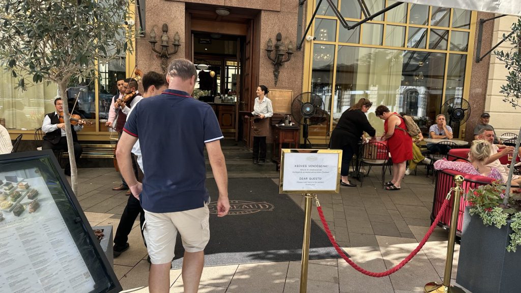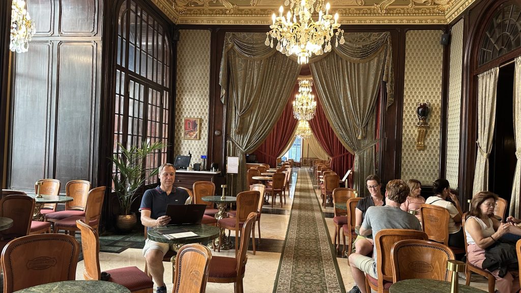 Wir begeben uns ins Café Geberaud, für einen Kaffee. Und ein Glas Wasser.