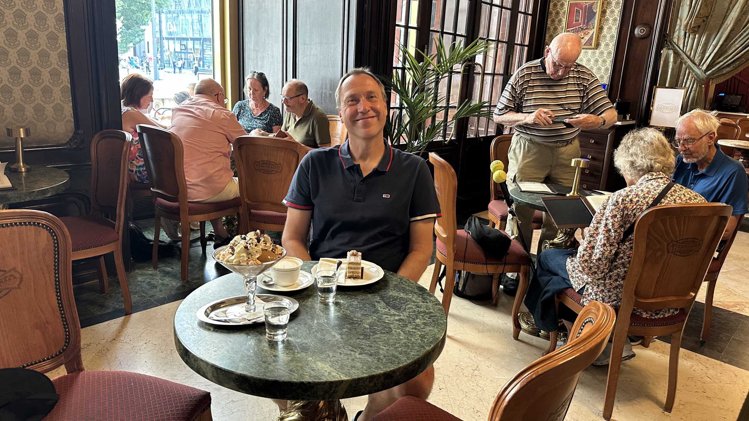 Wir begeben uns ins Café Geberaud, für einen Kaffee. Und ein Glas Wasser.