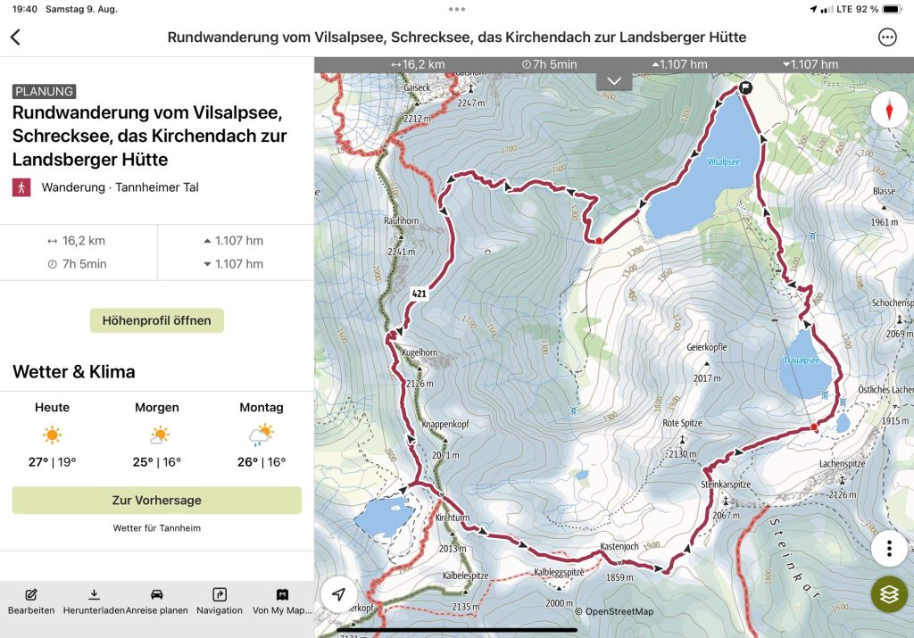 Vom Vilsalpsee zum Schrecksee, über die Landsberger Hütte zurück zum Vilsalpsee. Die Wanderung ist ca. 18 km, 1.100 hm, und soll in 7,5 h zu schaffen sein.