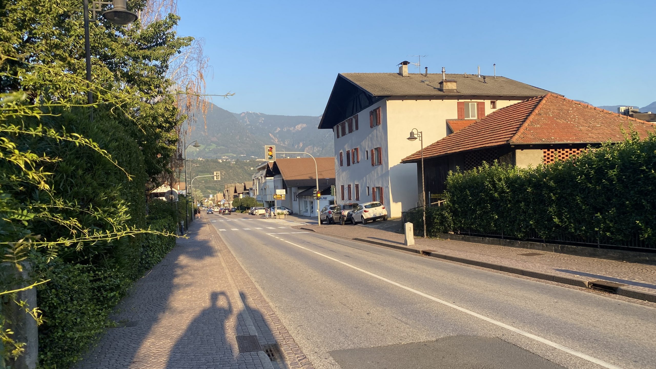 Der Bus fährt bis Naturns, wo wir umsteigen müssen in den Bus Richtung Meran. Jetzt sitze ich an der Bushaltestelle in Naturns und warte auf den Bus 251 nach Meran. Da muss ich 3 Haltestellen vorher in Algund aussteigen, und zum Hotel „Zum Hirschen“. Das hat einen Pool, Duschen mit warmen Wasser. Vielleicht habe ich ein eigenes Zimmer…
