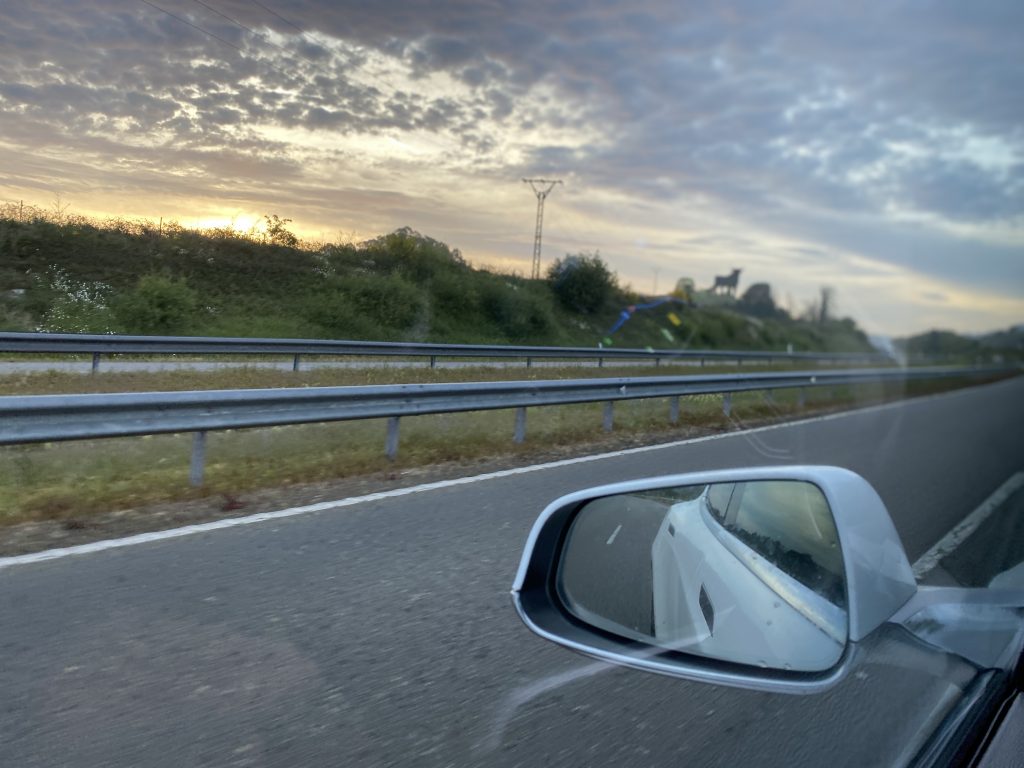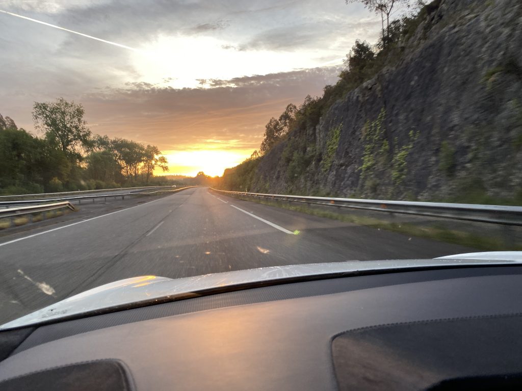 Dann geht es weiter nach Bilbao. Gegen 08:00 erreiche ich Reocin zum Laden. Die Straßen waren frei, der Sonnenaufgang war schön. Aber direkt an der Küste gibt es Nebel.