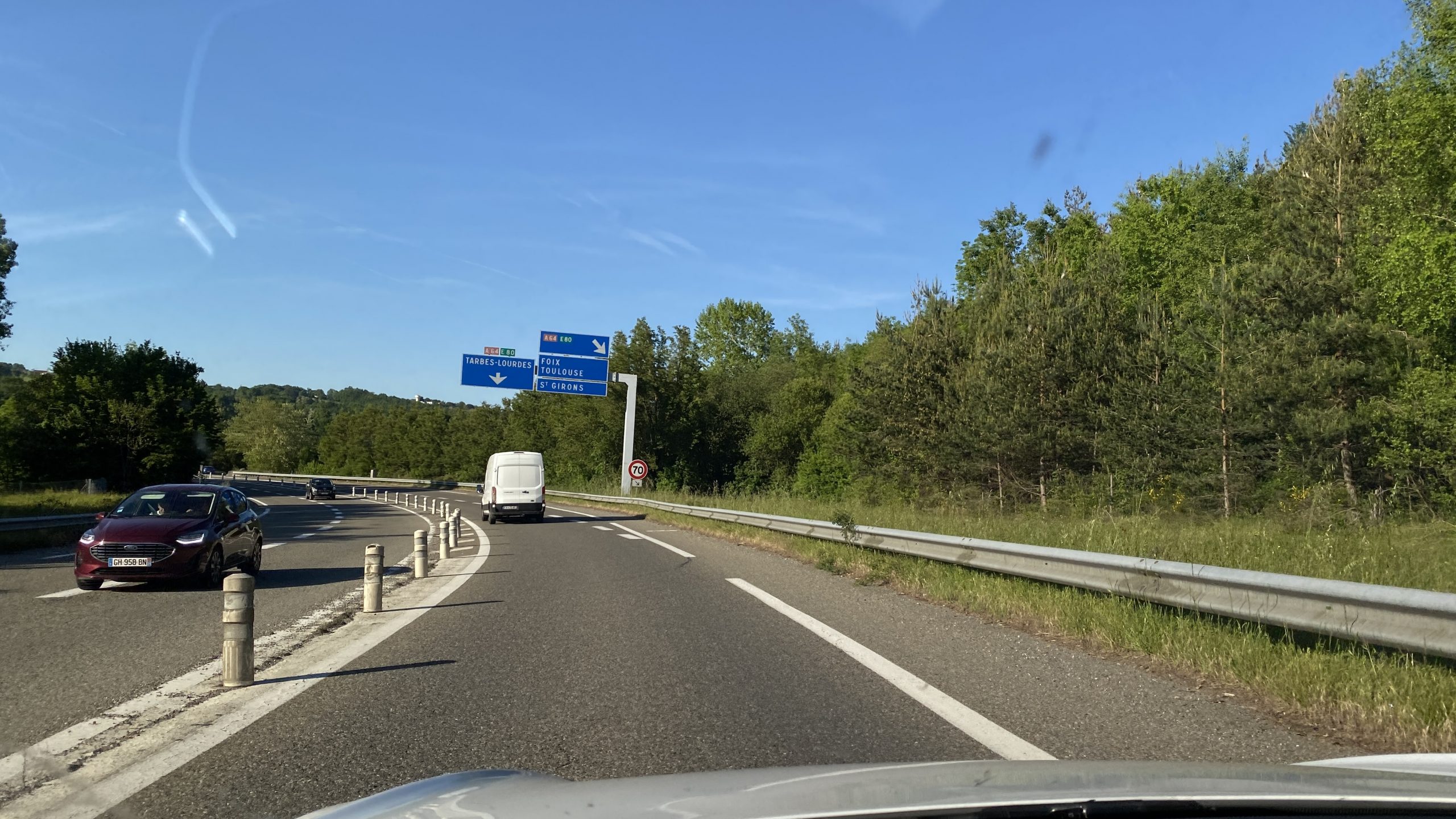 Die Fahrt war dann doch anders als erwartet. Ich fahre parallel zu den Pyrenäen, und bis Lourdes hatte ich eine gute Autobahn. Danach hatte ich Landstraßen mit zweistelligen Nummern. Die sind ok, haben einen Mittelstreifen und man darf und kann 80 km/h fahren.