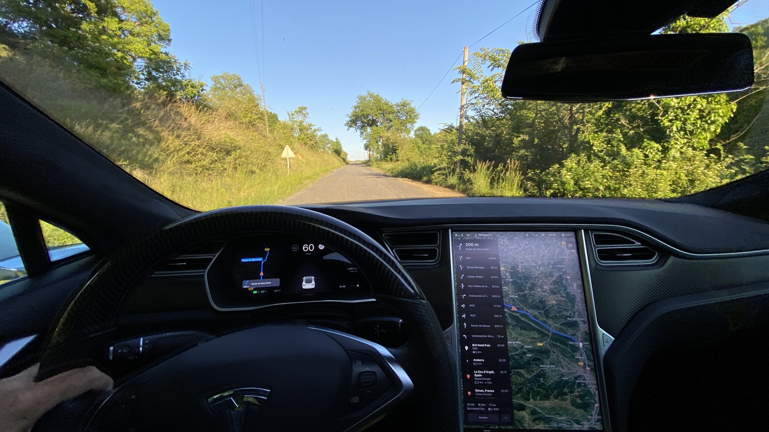 Das Auto hatte den nächsten Stopp in San Sebastian geplant. Auf der Fahrt dahin entscheidet es sich anders, und lotst mich weiter bis nach Bayonne in Frankreich, mit 5% Restladung. Das finde ich mutig, da es über 200 km sind. Bisher hab ich das immer 2-3% mehr gebraucht, wenn ich den Autopiloten hab machen lassen.