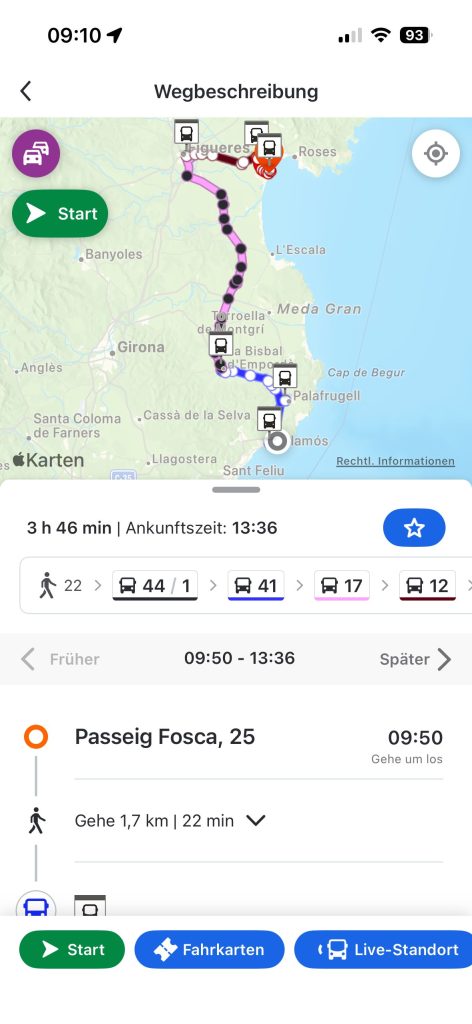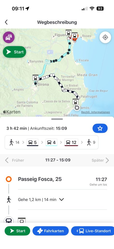 Öffentliche Verkehrsmittel sind möglich, aber mit einigen kleineren Wanderungen zwischen den Haltestellen. Die beste Verbindung war über Girona, dann nach Castell D‘Empuries. Alle benötigten mindestens 3:40 Minuten.