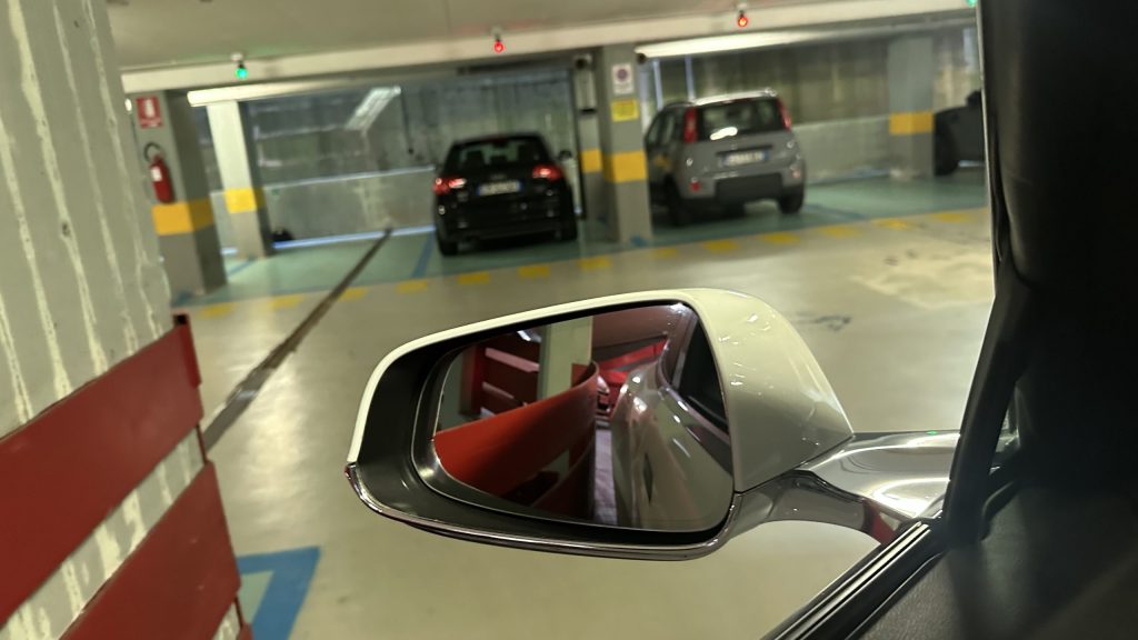 Es gibt zwei Parkhäuser, eins ist voll. Das Andere ist unglaublich eng. Im Rückspiegel kann man sehen wie wenig Platz da war. Ich stand fast diagonal in der Kurve.