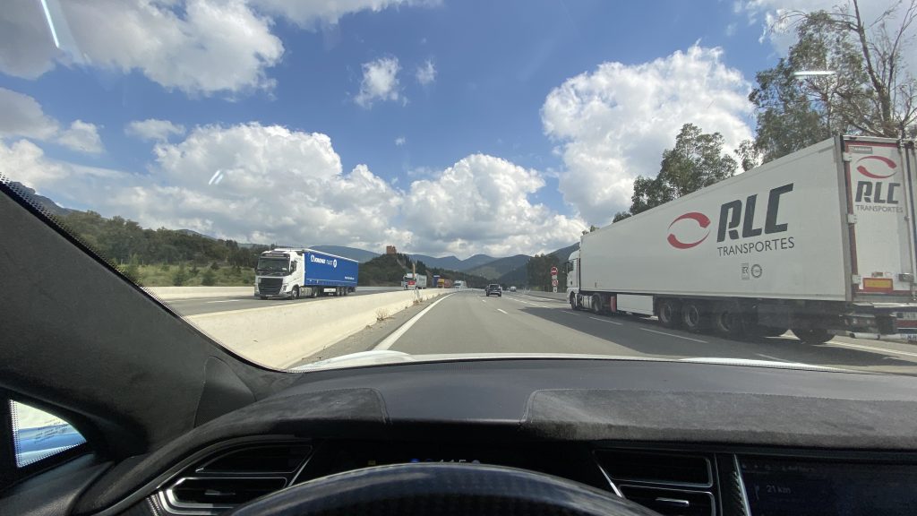 Nach gut drei Stunden und ca. 300 km hab ich den Supercharger Narbonne erreicht, kurz vor der spanischen Grenze. Die Fahrt war staufrei, kurz vor Narbonne gab es einen angebrannten Sattelschlepper, und etwas zähflüssigen Verkehrs. Alles in allem ging es gut.