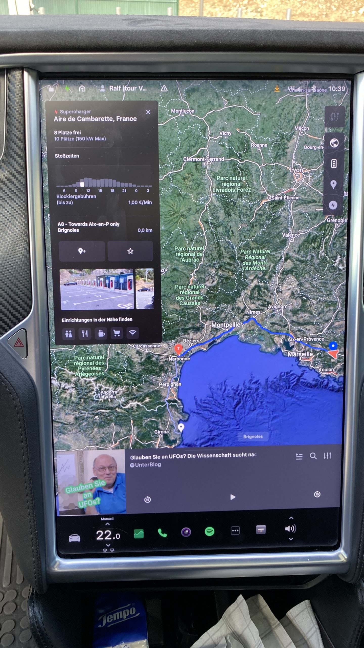 Gegen 10:00 bin ich am SuC Aire de Cambarette, kurz vor Marseille. Von da geht es 3h weiter bis zum SuC Narbonne, ich muss ihn relativ voll laden.