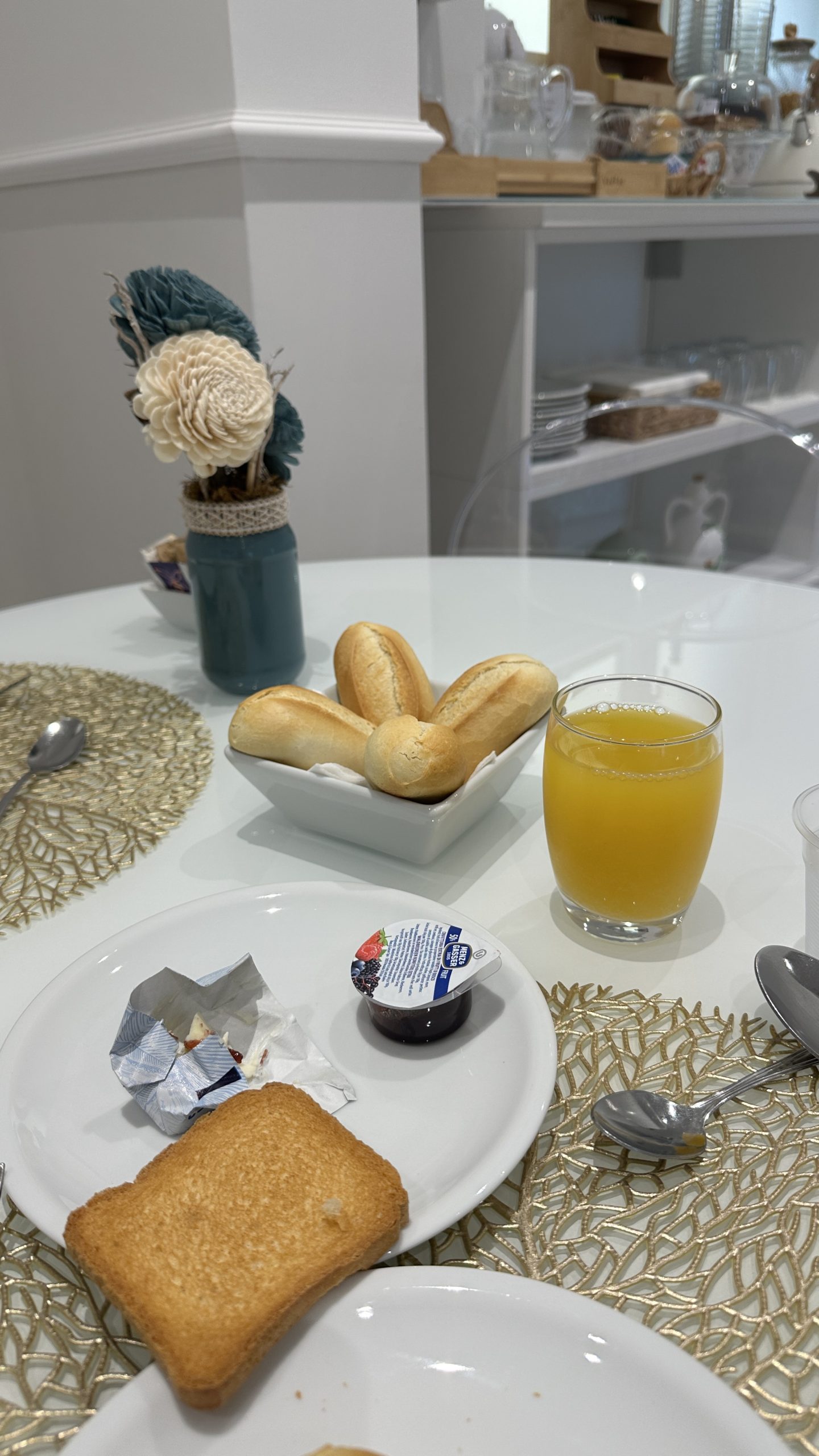 Dann kommen noch vier Mini Baguette, mit der Konsistenz von Keksen, Orangensaft und Kaffee. Morgen fahre ich um 06:00 los, da muss ich dann darauf verzichten.
