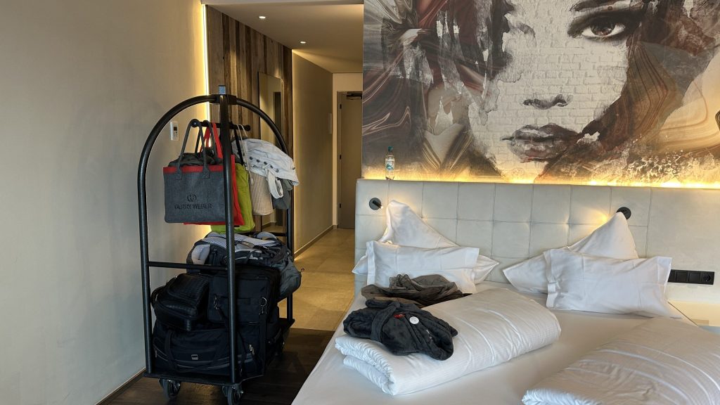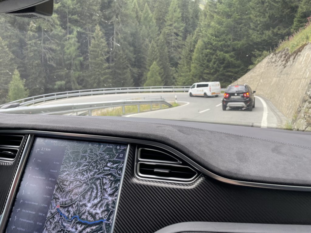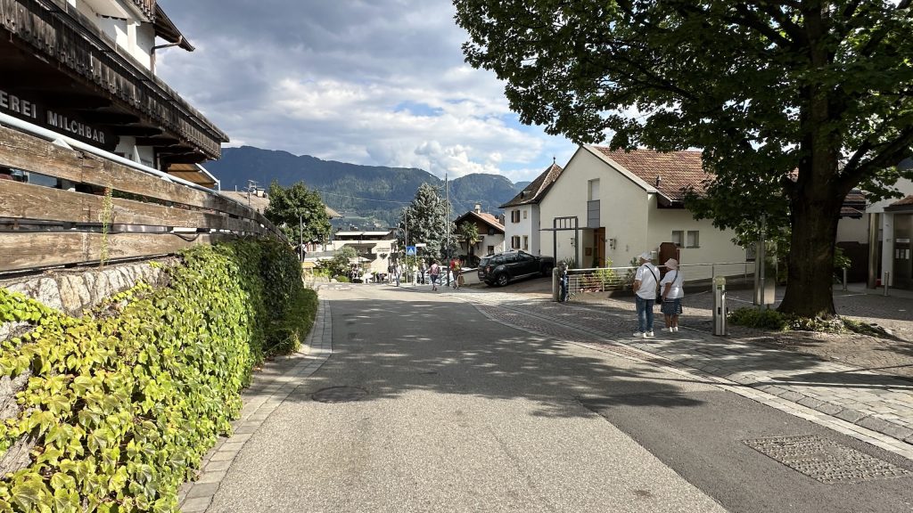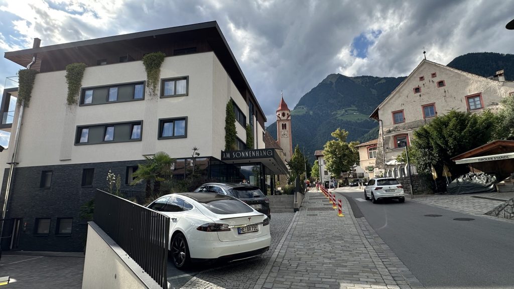 Die Fahrt über die Pässe dauert schon einige Zeit, wenngleich der Verkehr nicht so stark war. Es gab einige Straßenarbeiten mit Ampel. Aber nichts nennenswertes. Um 16:00 erreichen wir Dorf Tirol. Nach zwei weiteren Biopausen. Ich mutiere zum Mädchen…. 😰