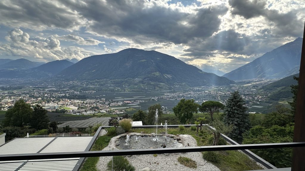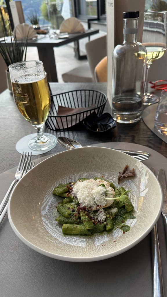 Das erste Abendessen war soweit ok. Das Hotel liegt zentral im Dorf Tirol, umringt von Kirchen. Deren Glocken immer irgendwie läuten. Aber ich finde Glocken in dieser Gegend besser als ein Muezzin ….