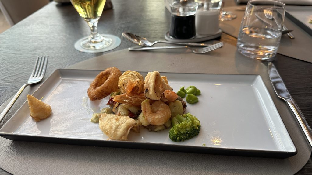 Fritto Misto ist übersichtlich arrangiert mit mediterranem Kartoffelsalat.