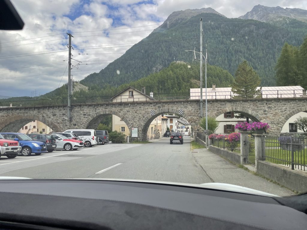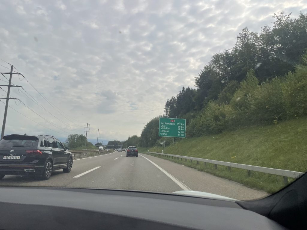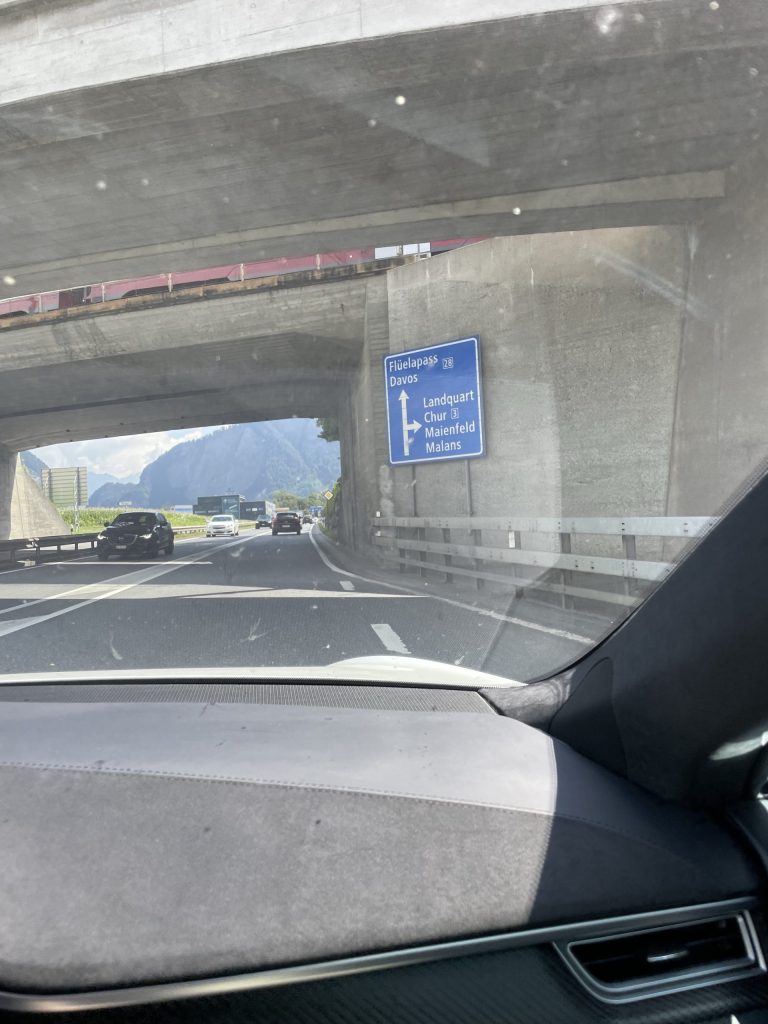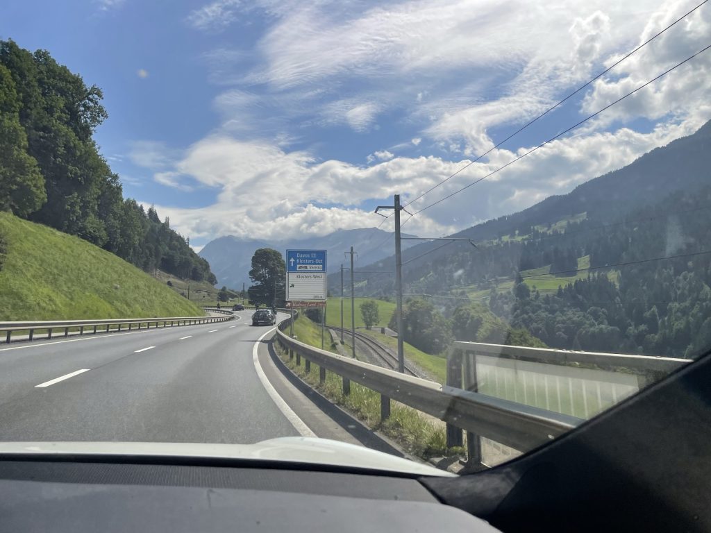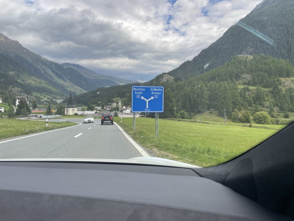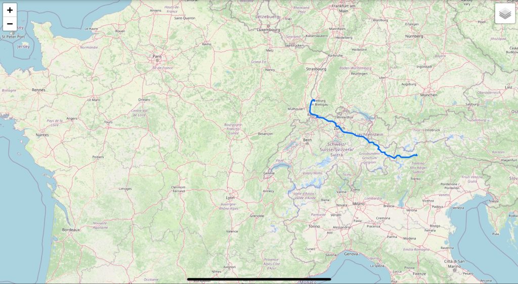 Die Route führt über Basel, Zürich, am Zürichsee entlang Richtung Davos. Und weiter Richtung St. Moritz und dann Meran.