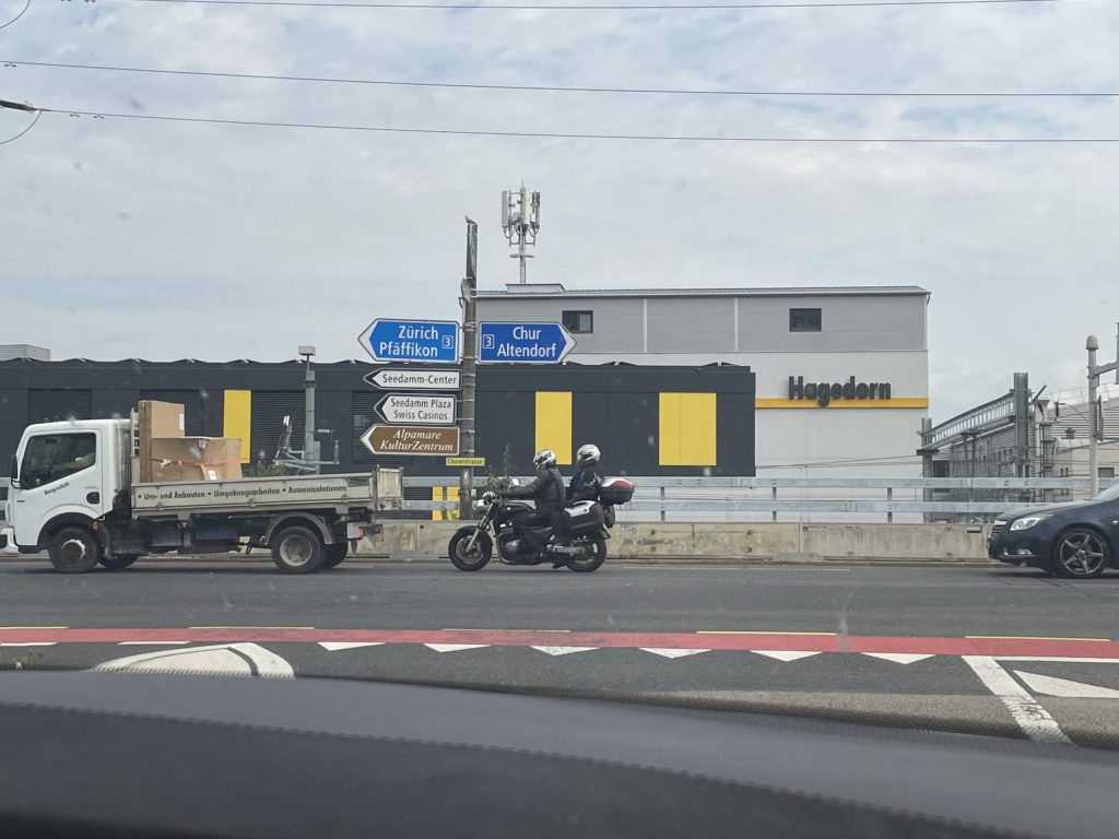 Eine Pause gab es an einem Einkaufszentrum in Pfäffikon in der Schweiz. Die Verkehrsführung dahin war etwas abenteuerlich. Und ohne Jürgen bin ich einmal falsch abgebogen. Bei mir sind die Navi Ansagen deaktiviert. Bei Jürgen nicht…