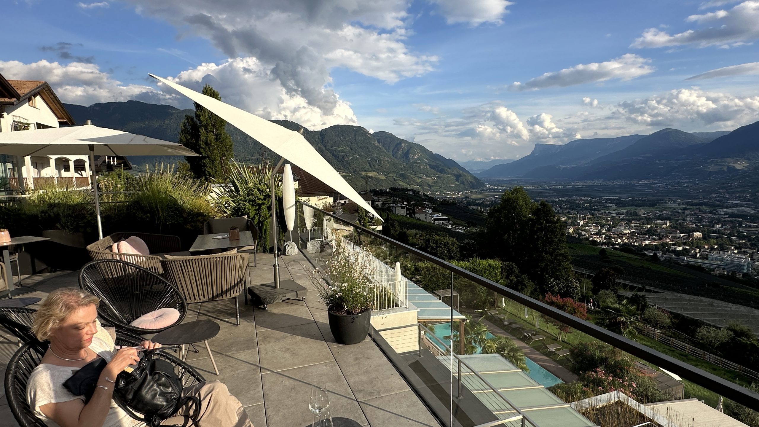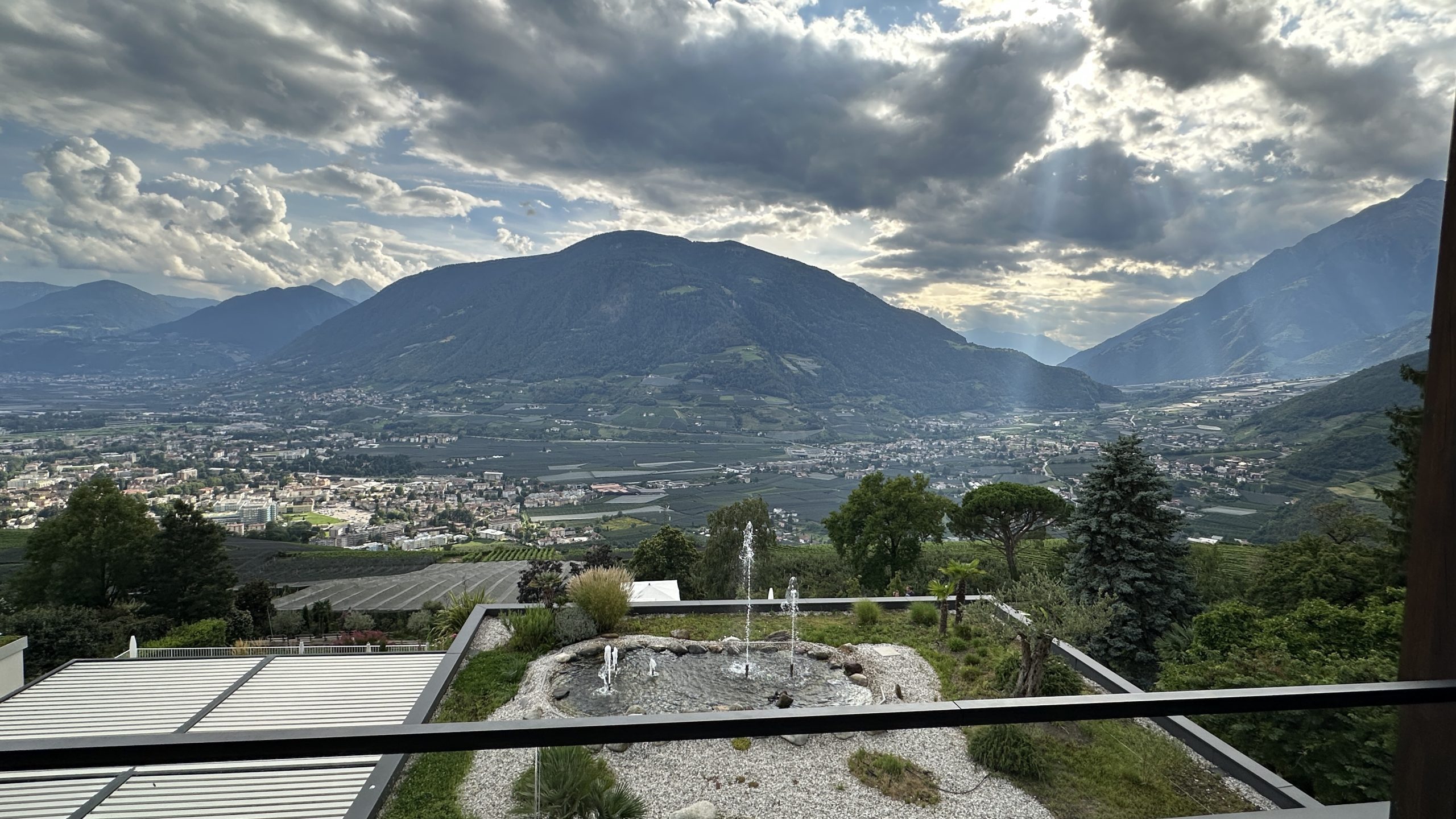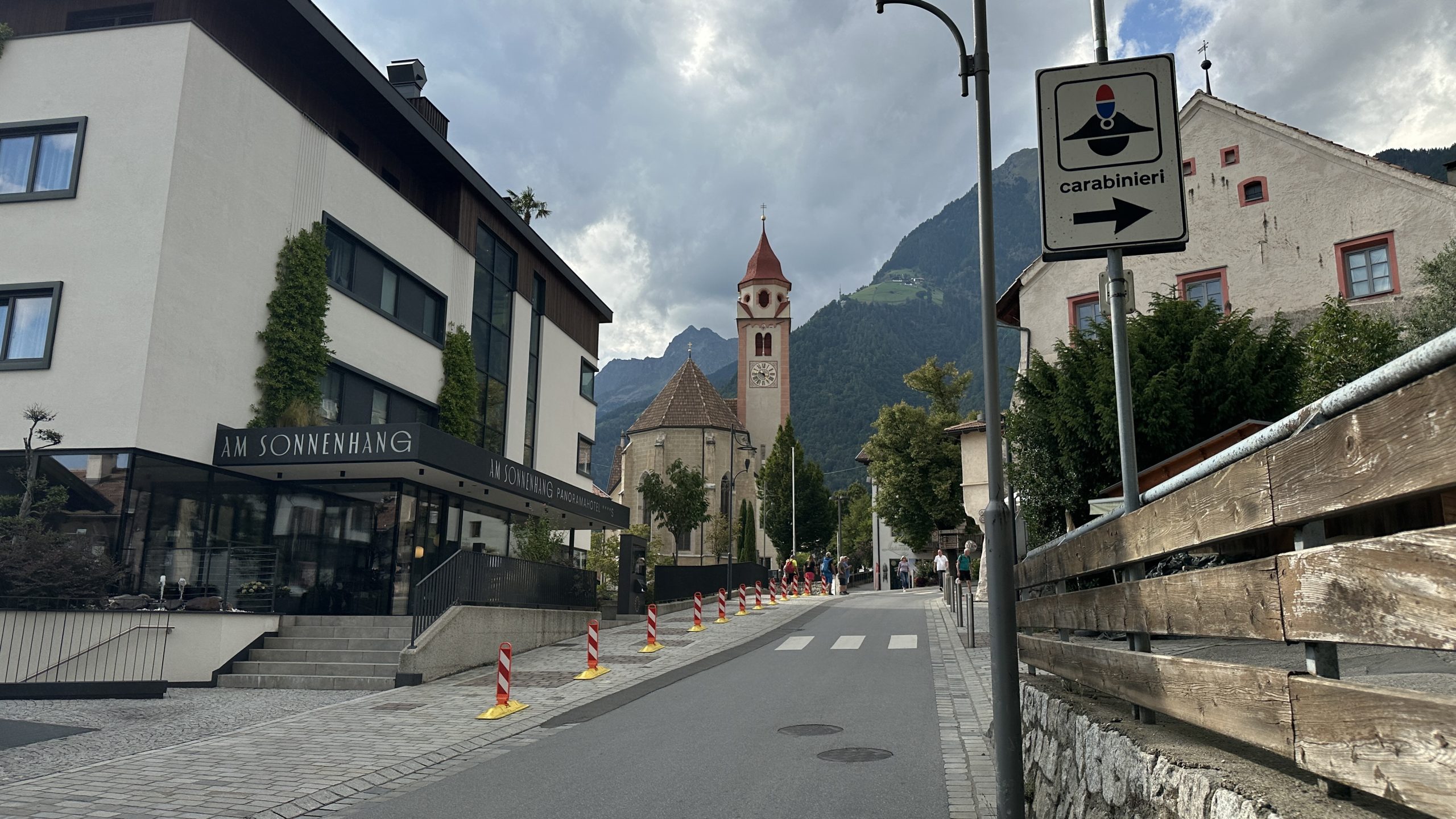 Die Fahrt über die Pässe dauert schon einige Zeit, wenngleich der Verkehr nicht so stark war. Es gab einige Straßenarbeiten mit Ampel. Aber nichts nennenswertes. Um 16:00 erreichen wir Dorf Tirol. Nach zwei weiteren Biopausen. Ich mutiere zum Mädchen…. 😰