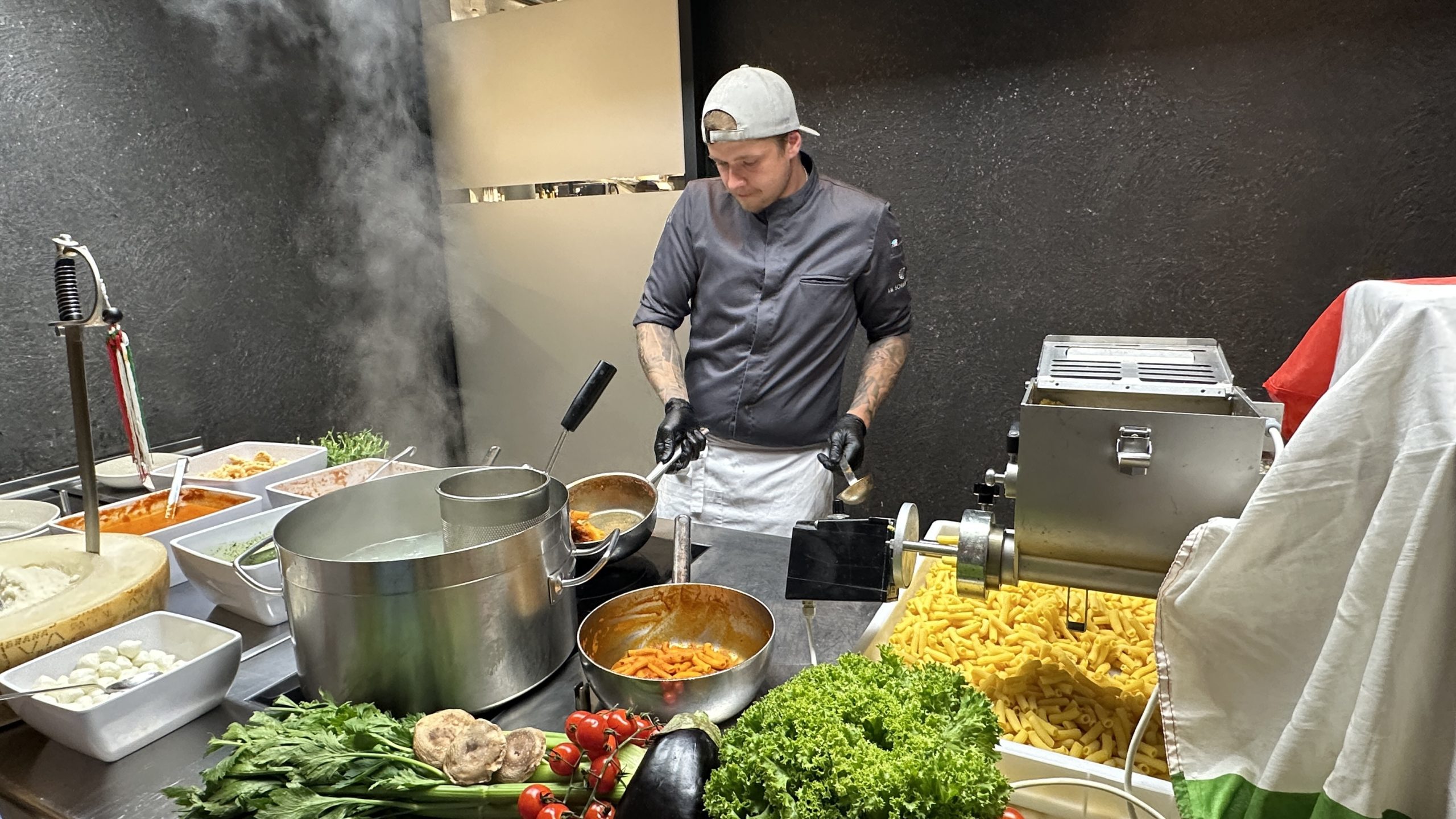 Aber weiter mit dem Abendessen (inklusive). Für eine spärliche Portion Nudeln darf man Schlange stehen.