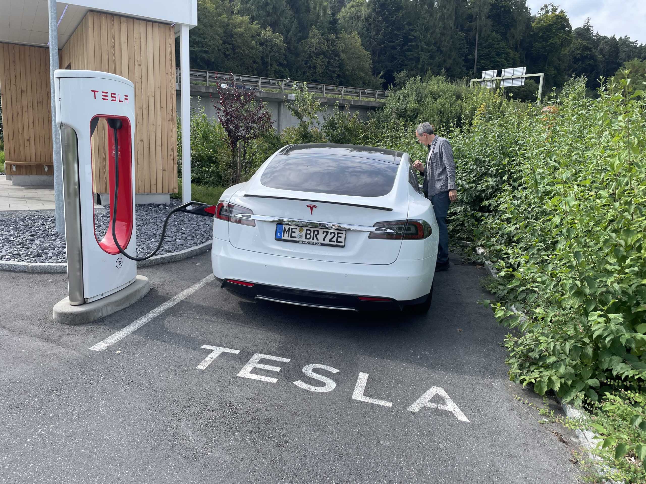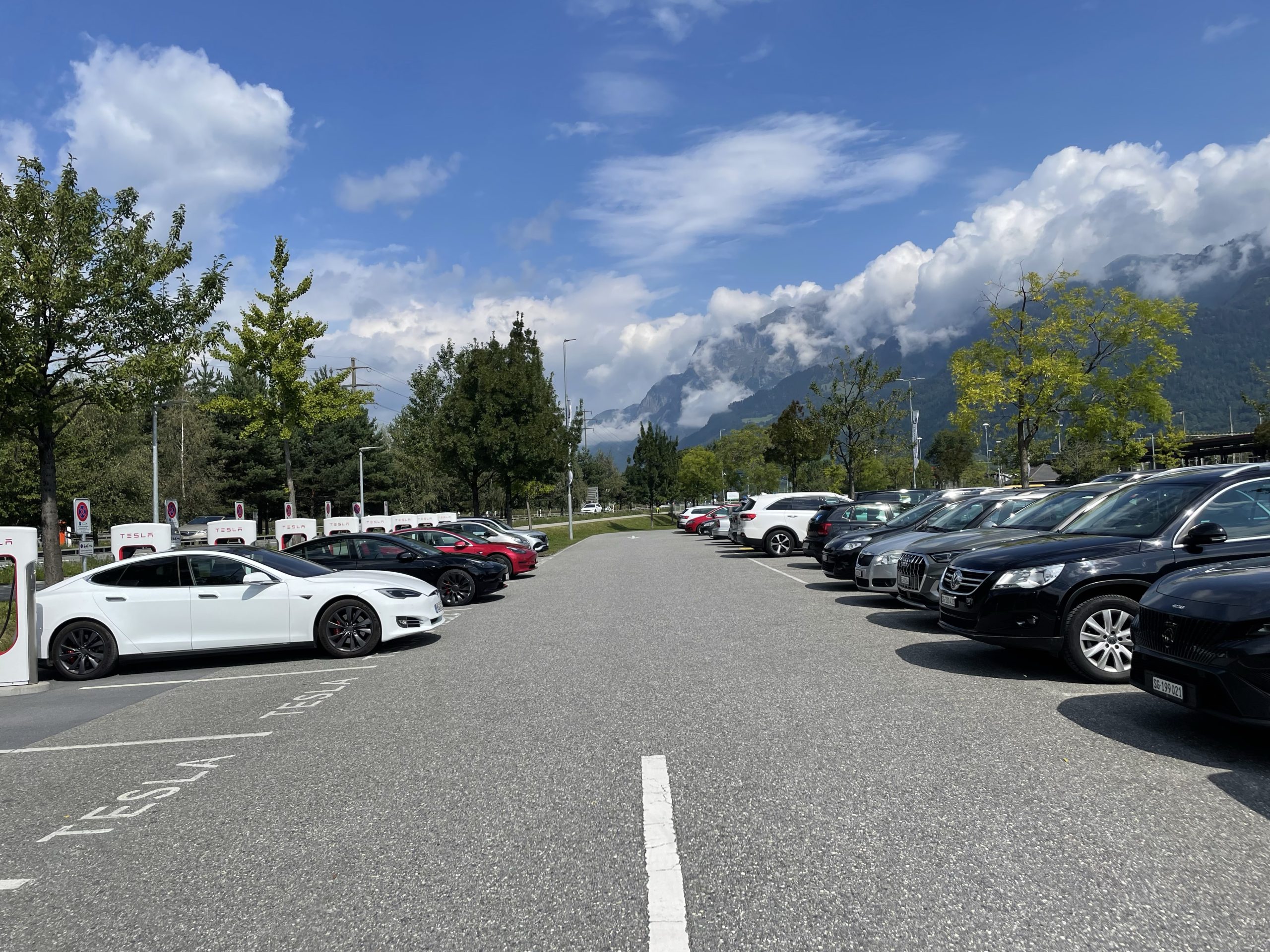 In einem Shopping Park in Landquart brauchen wir noch eine Biopause. Tesla hat hier 14 Ladesäulen. Ab hier sind es noch ca. 200 km über den Füelapass und den Ofenpass.
