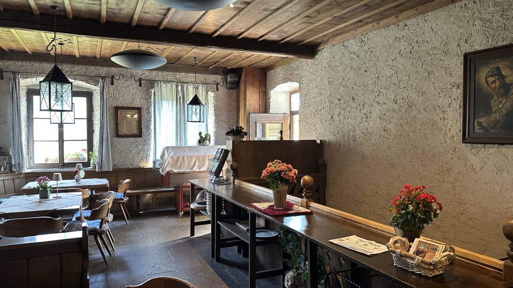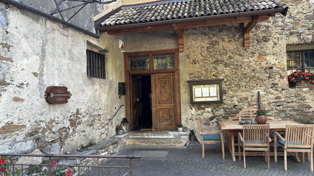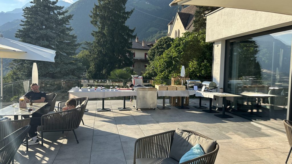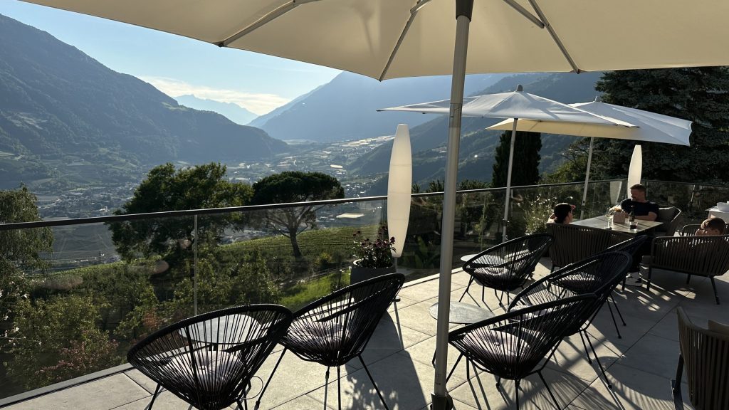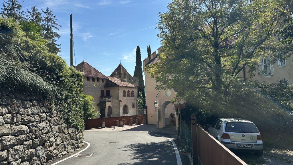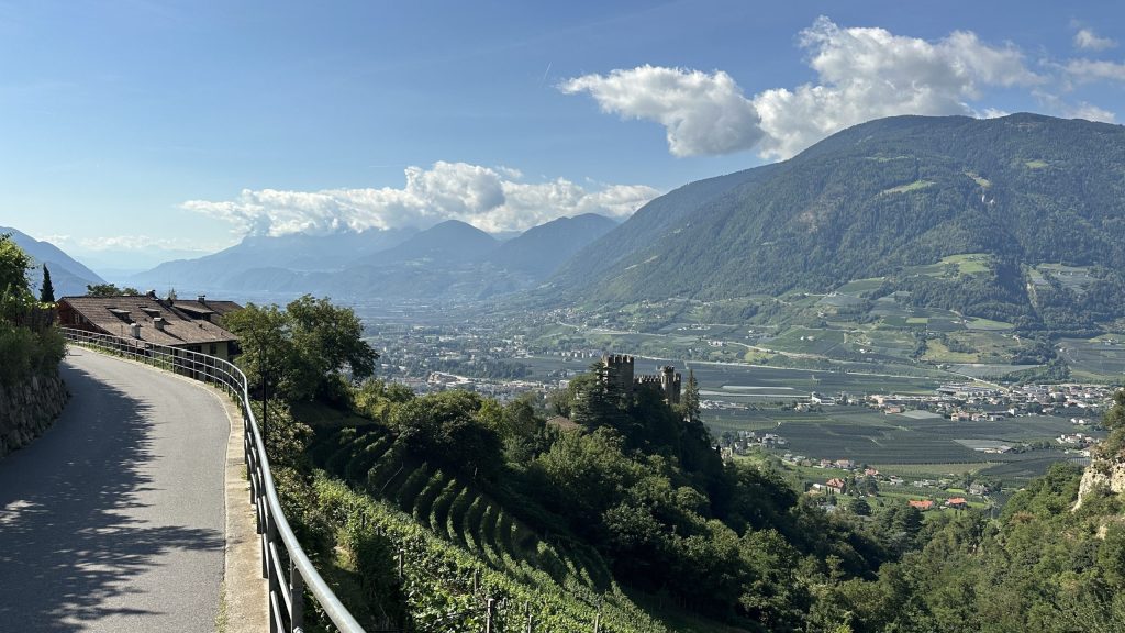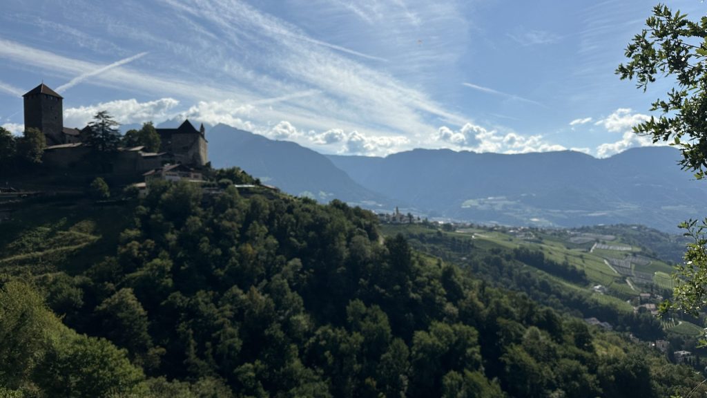 Eine Bio Pause machen wir am Haus Thurnstein, ein schlossartiges Gebäude mit schönem Ausblick Richtung Dorf Tirol und Meran.