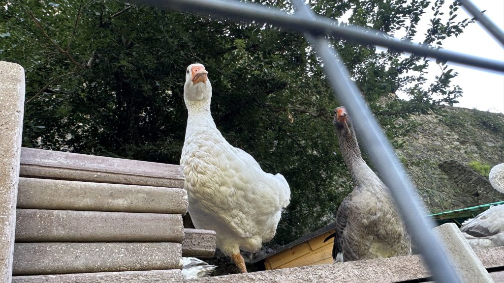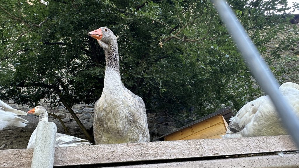 Um 10:00 wandern wir los, es geht erst zum Schloss Tirol. Gut bewacht von dominanten Gänsen.
