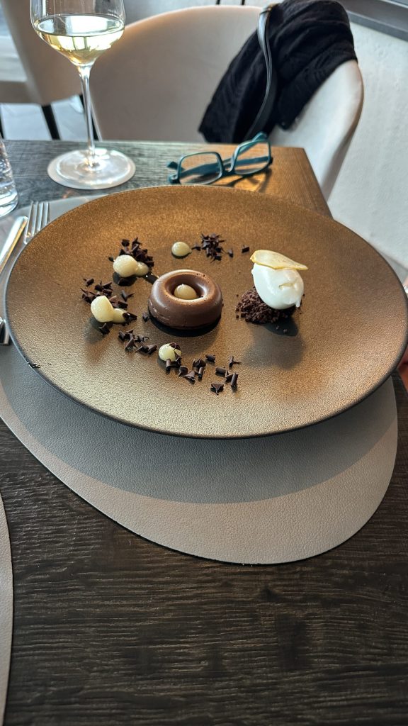 Und wem es dann noch nicht reicht, der bekommt dunkle Valrhona Schokolade mit Williams Birne. Dann muss aber gut sein!