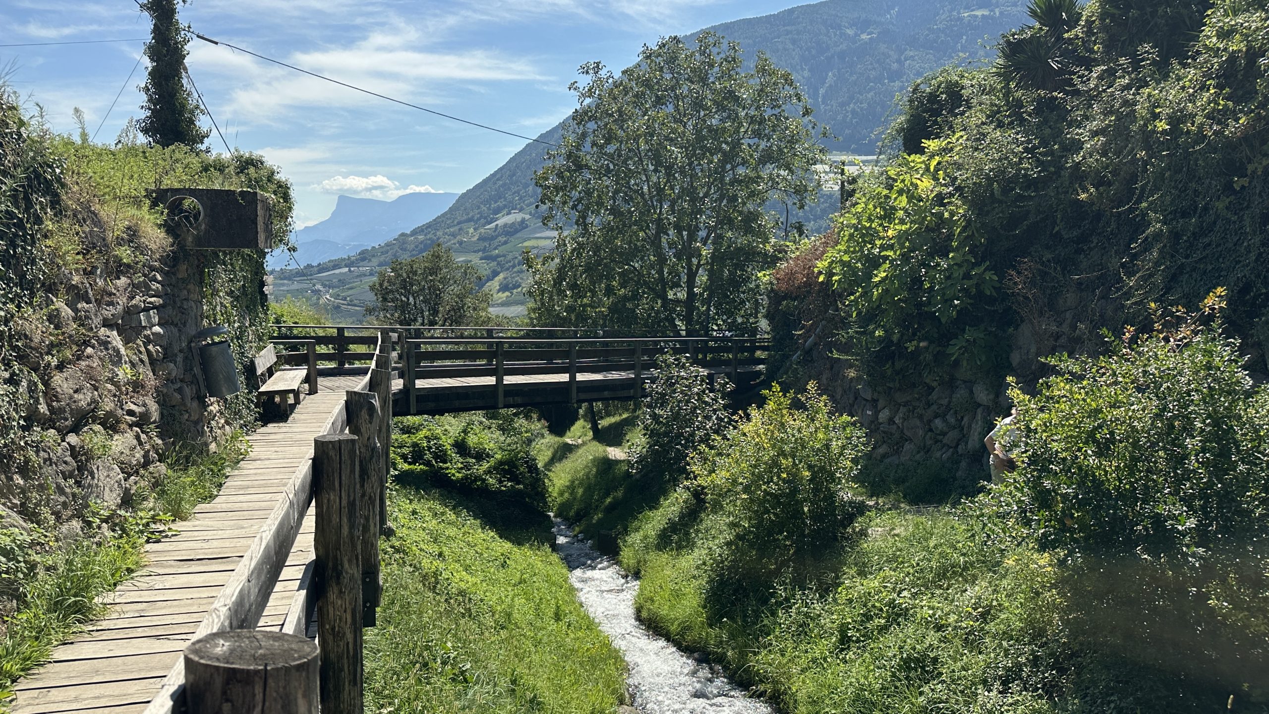 Ab Algund geht es über einen tiefer gelegenen Walweg wieder zurück Richtung Dorf Tirol.