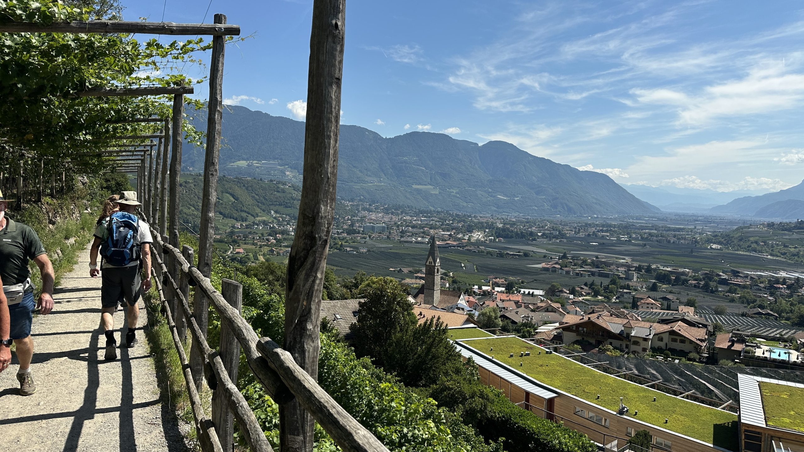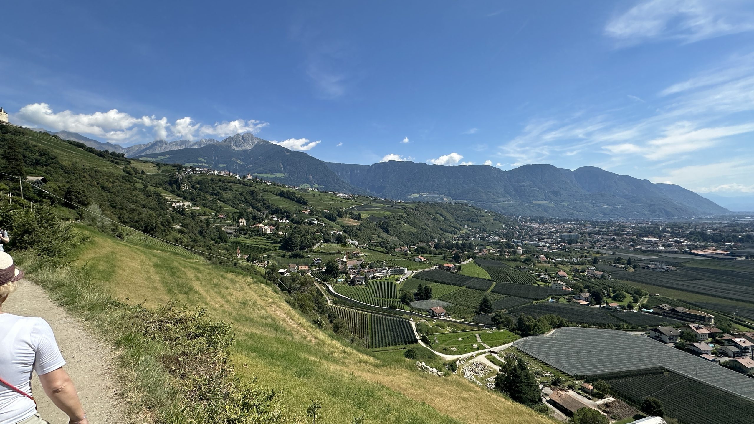 Man hat die ganze Zeit einen schönen Blick über das Meraner Tal und auf die Berge.
