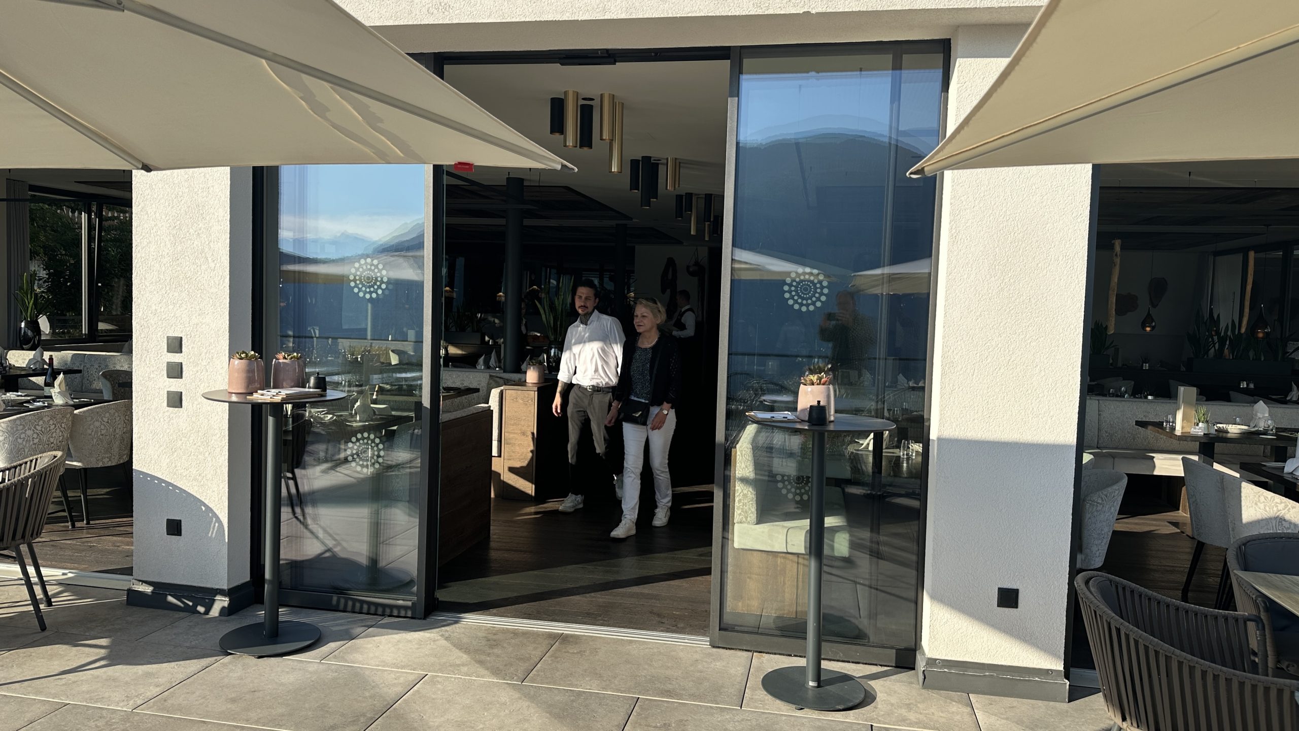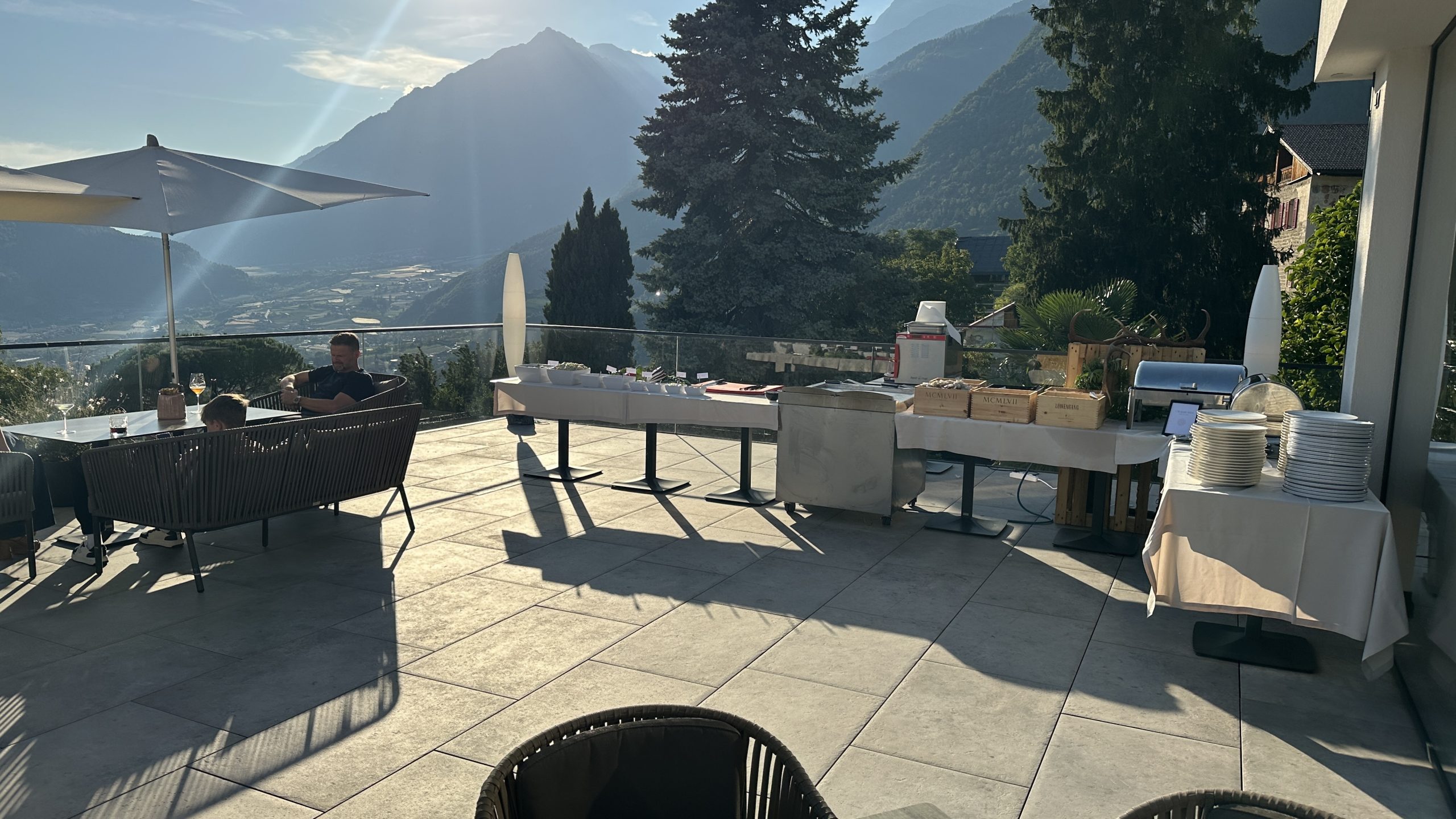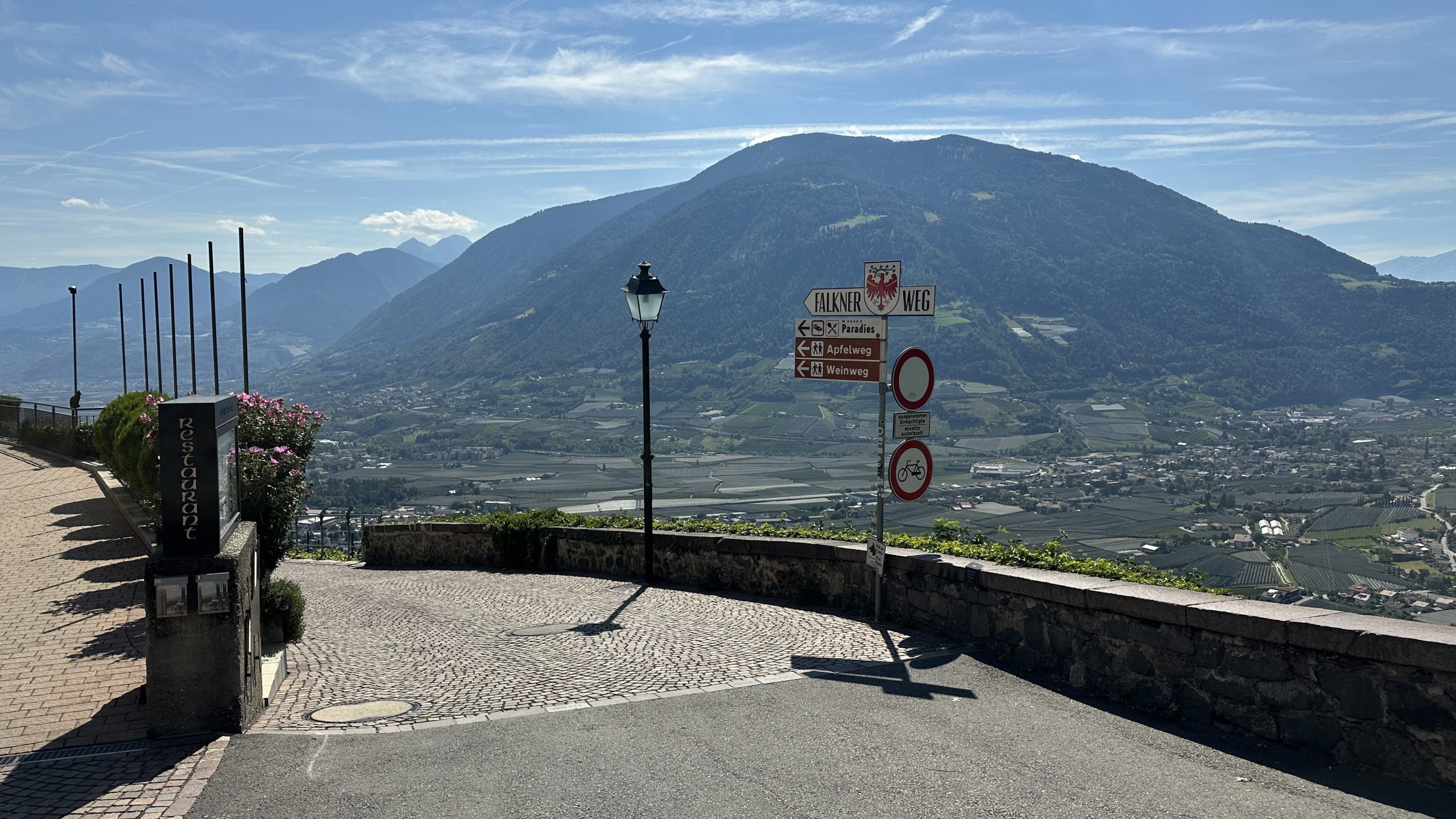 Eine Bio Pause machen wir am Haus Thurnstein, ein schlossartiges Gebäude mit schönem Ausblick Richtung Dorf Tirol und Meran.