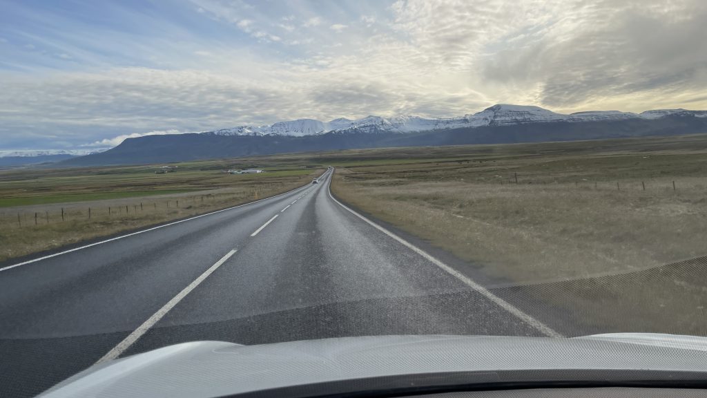 Ich fahre weiter Richtung Akureyri, und muss aber noch in Stadarskali laden. Es sind nun draussen -1°C, und ich bekomme eine Reifendruck Warnung. Es ist zu kalt, der Reifendruck ist gesunken.