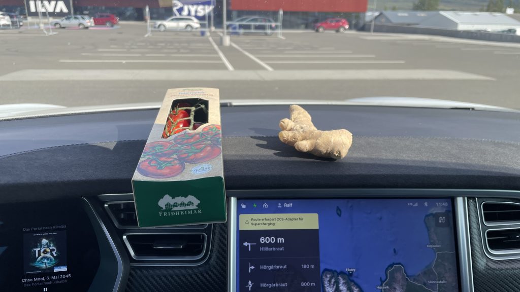 Von hier aus sind es zum Dettifoss noch 88 km, und ich könnte um 14:00 da sein. Ich werde dahinfahren, und dann wieder zurück zur Unterkunft hier in Akuryri. Am Supercharger ist ein Jysk, eine Fitnessbude und ein Supermarkt. Ich brauche Ingwer…